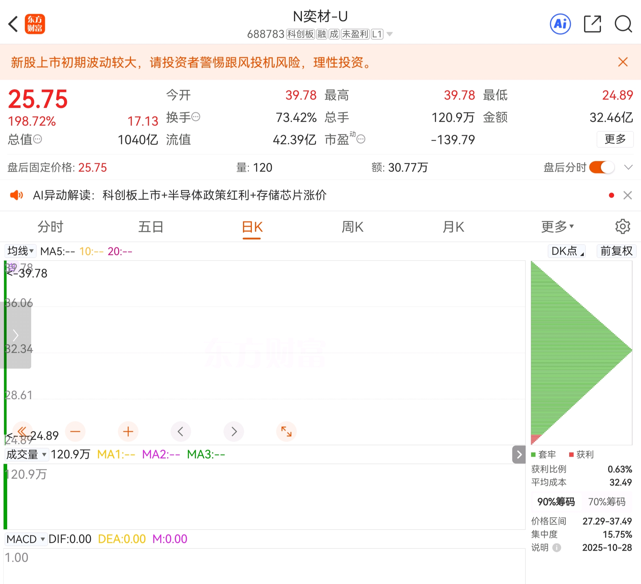 $N奕材-U(SH688783)$ 换手率73%,获利盘比率0.63%。