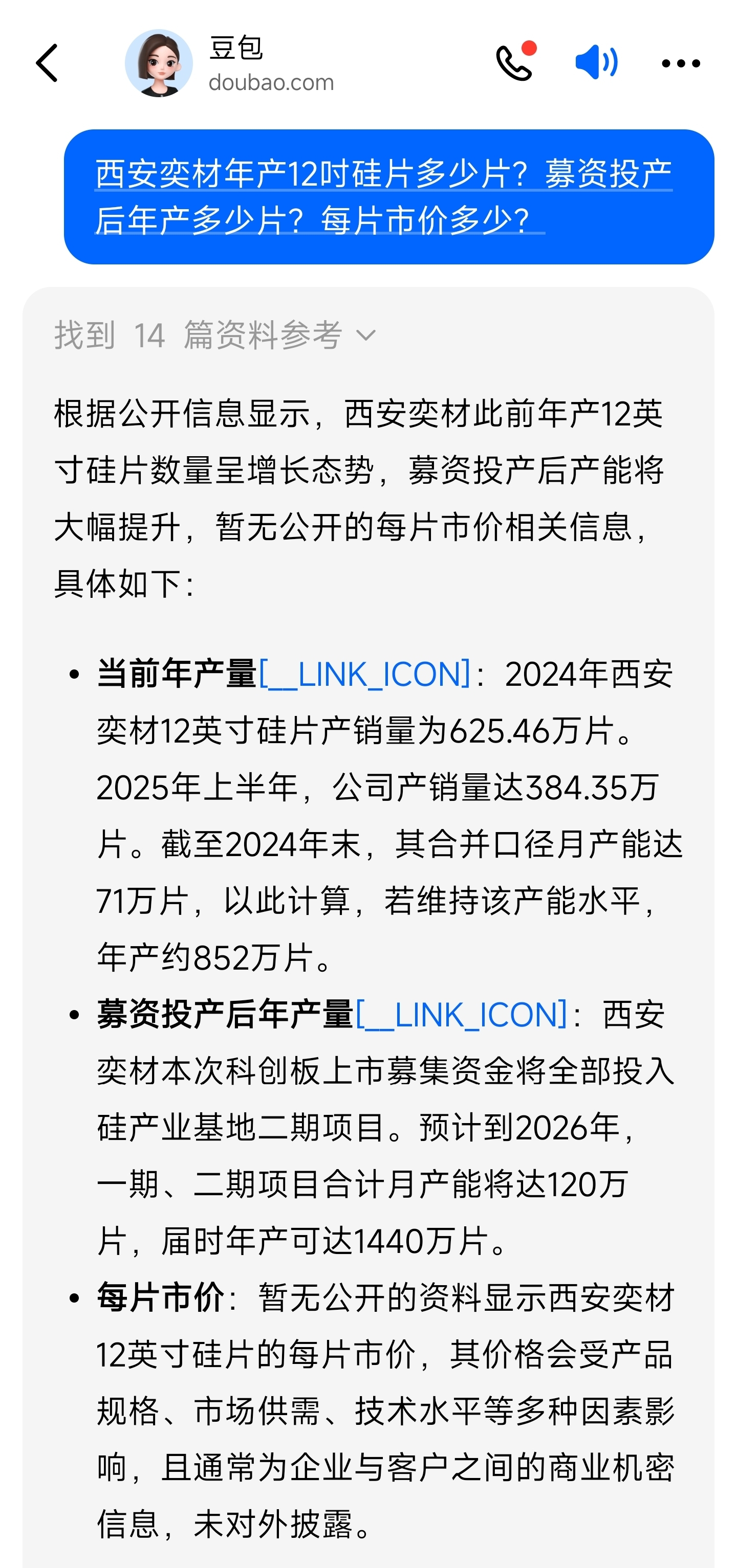 西安奕材年产硅片800多万片,募资扩产后达1400多万片,具体价格乃商业机密,由市价波动及买卖双方商谈而定,请看豆包分析: