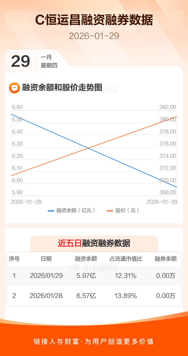 交易所最新数据显示,C恒运昌于2026年1月29日获融资买入1.83亿元,融资偿还2.43亿元,当日融资净偿还5985.93万元。目前,该股融资余额5.97亿,占流通市值比例为12.31%。