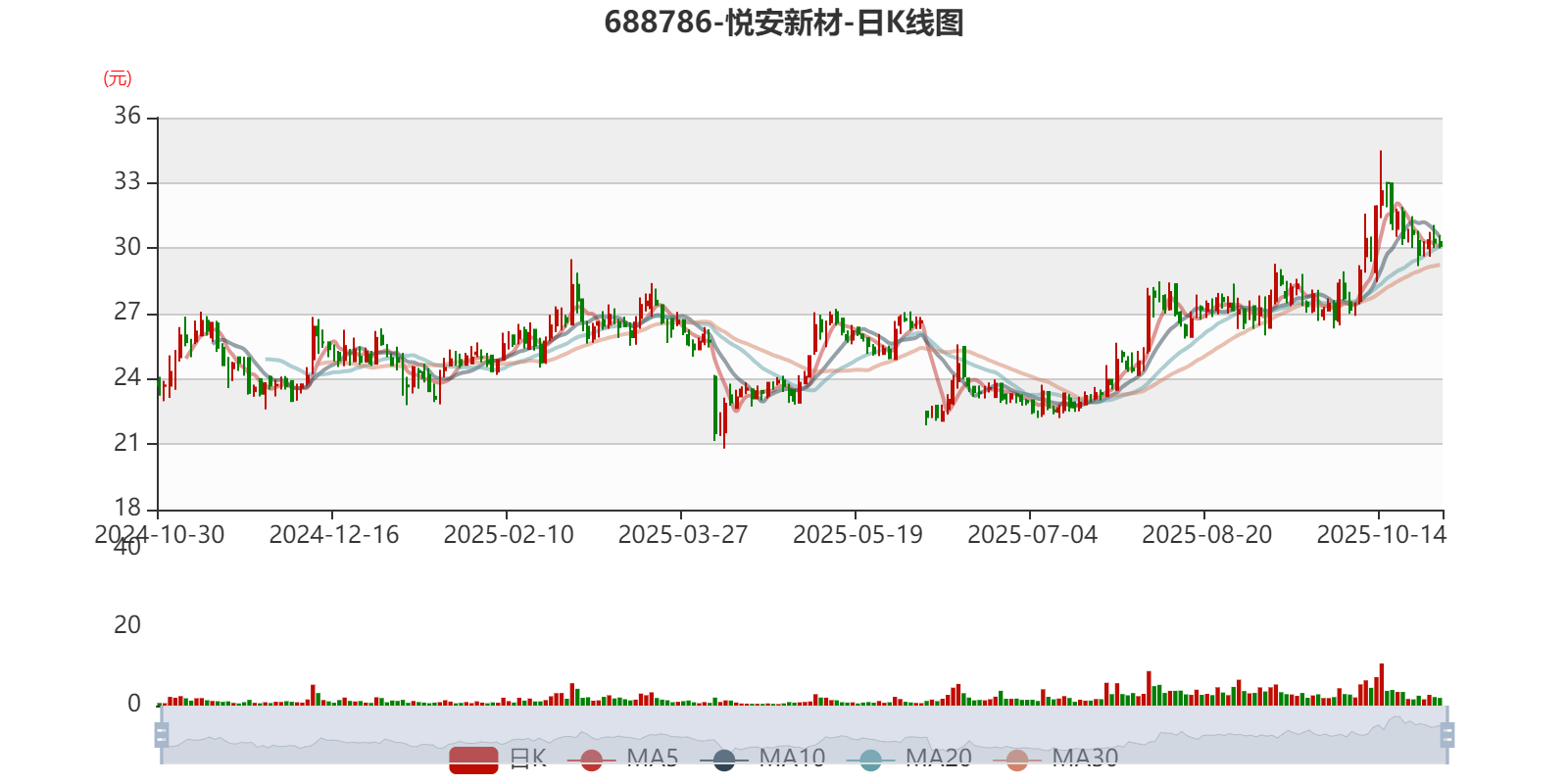 中证智能财讯悦安新材(688786)10月30日披露2025年第三季度报告。前三季度公司实现营业总收入3.21亿元,同比增长3.19%;归母净利润6141.58万元,同比增长9.04%;扣非净利润5752.45万元,同比增长10.65%;经营活动产生的现金流量净额为1.18亿元,同比增长147.14%;报告期内,悦安新材基本每股收益为0.43元,加权平均净资产收益率为8.43%。