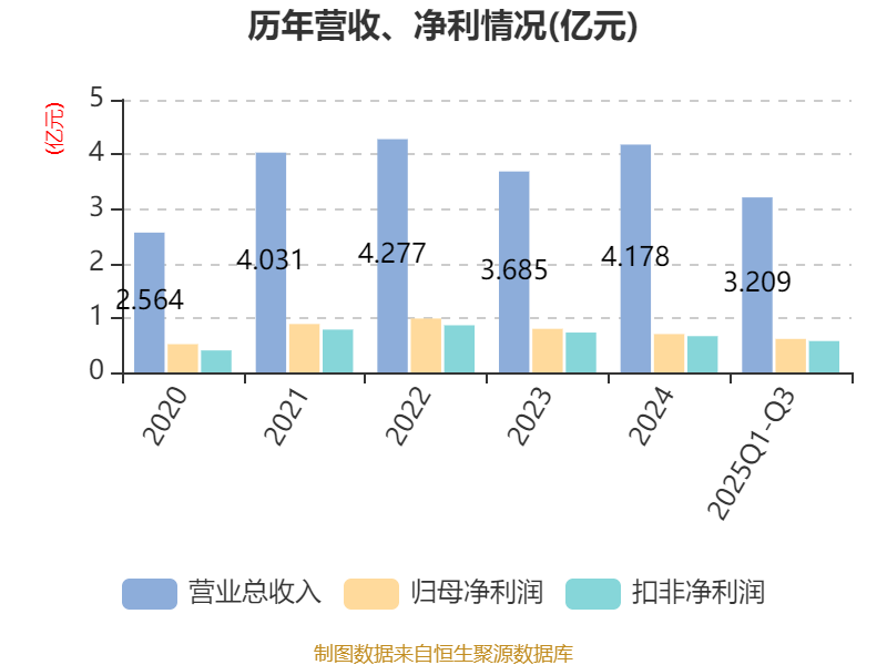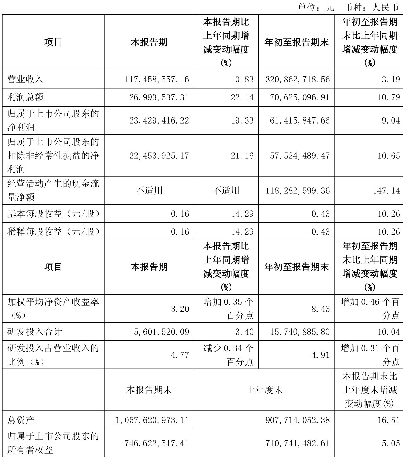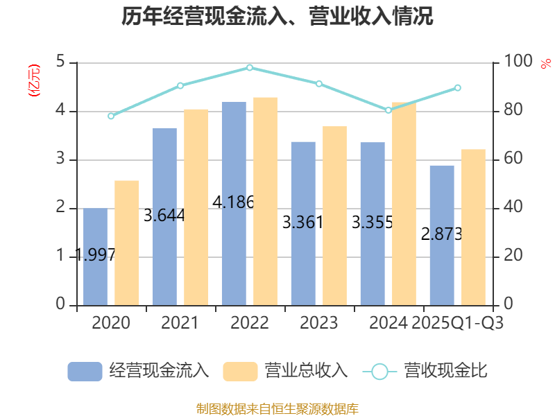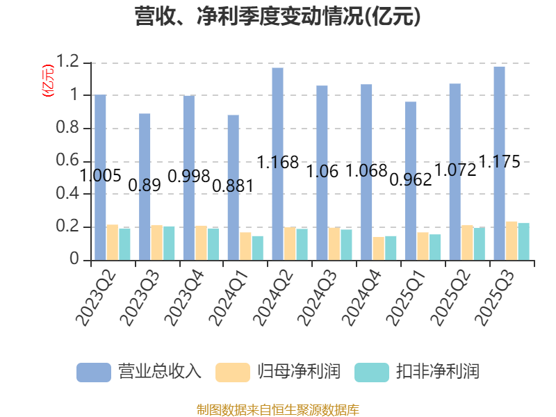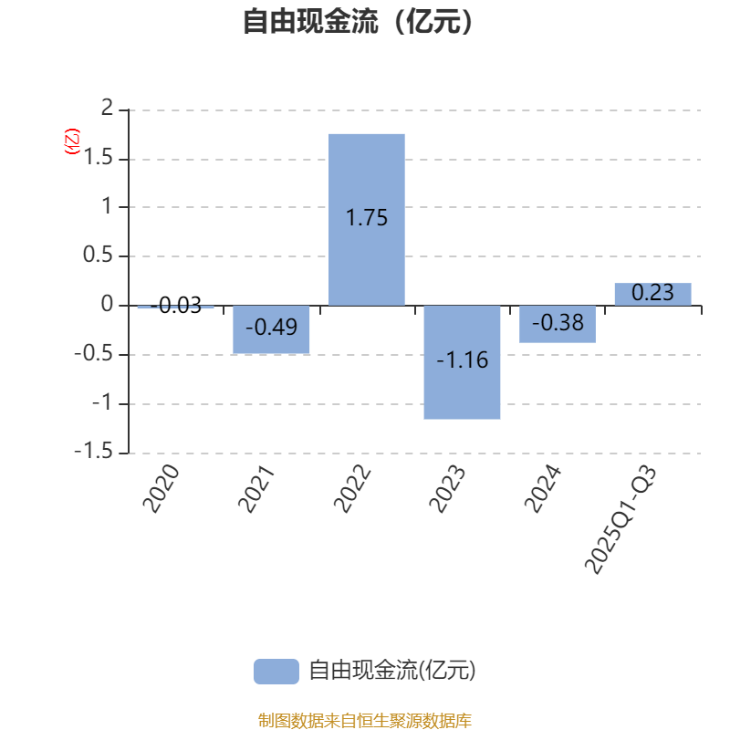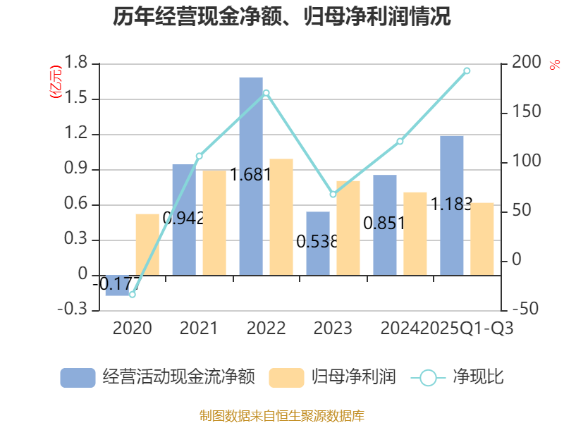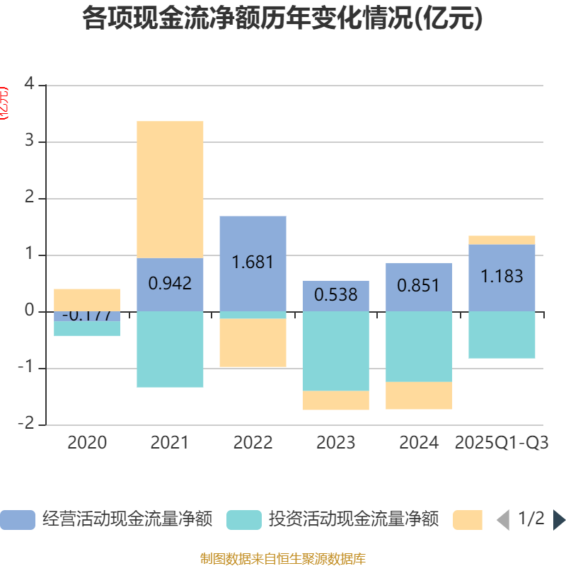 2025年前三季度,公司经营活动现金流净额为1.18亿元,同比增长147.14%;筹资活动现金流净额1520万元,同比增加7878.77万元;投资活动现金流净额-8319.68万元,上年同期为-9202万元。