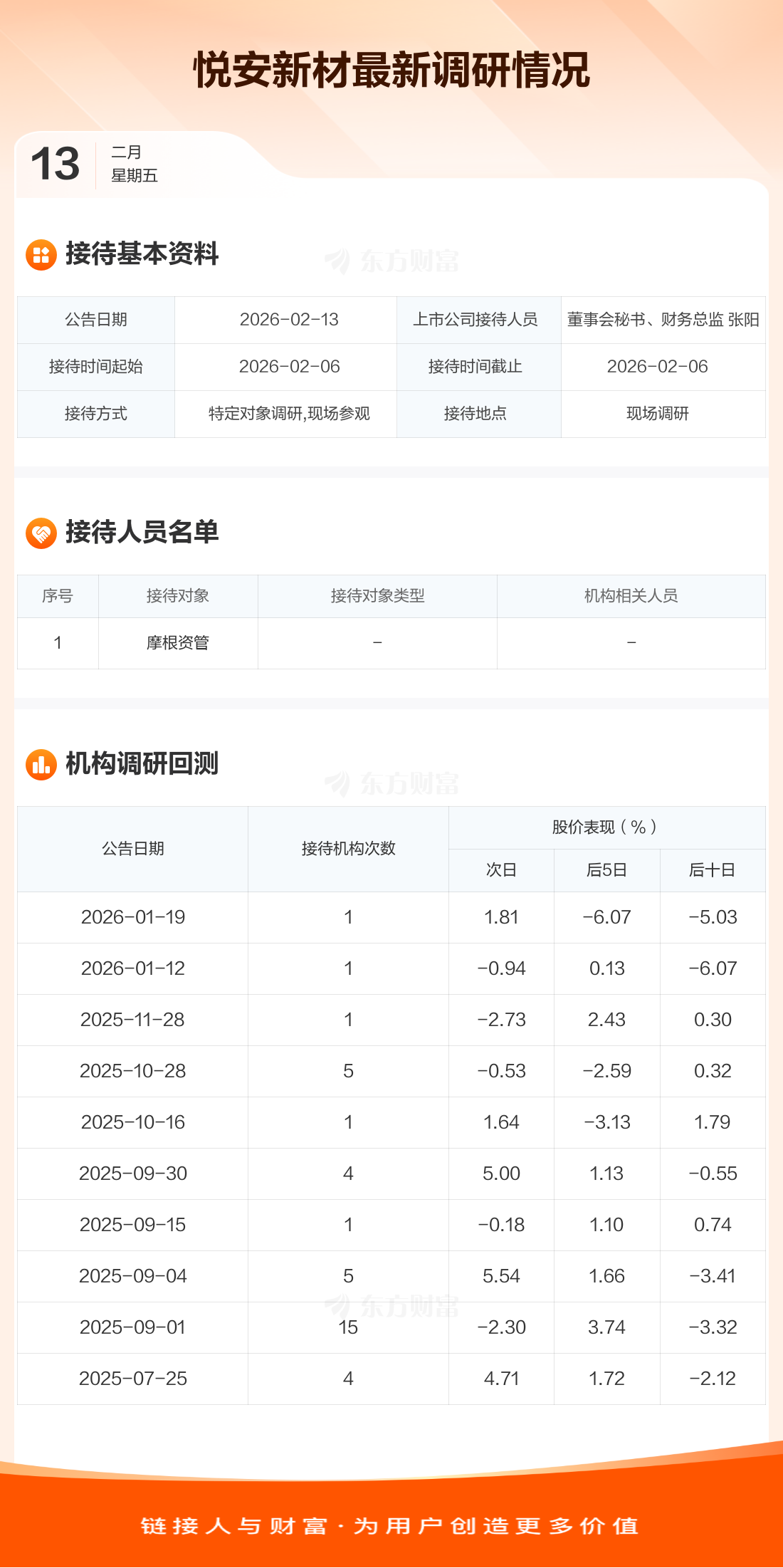 悦安新材2月13日公告称,2月6日接待摩根资管等1家机构调研。接待人员包括董事会秘书、财务总监 张阳。