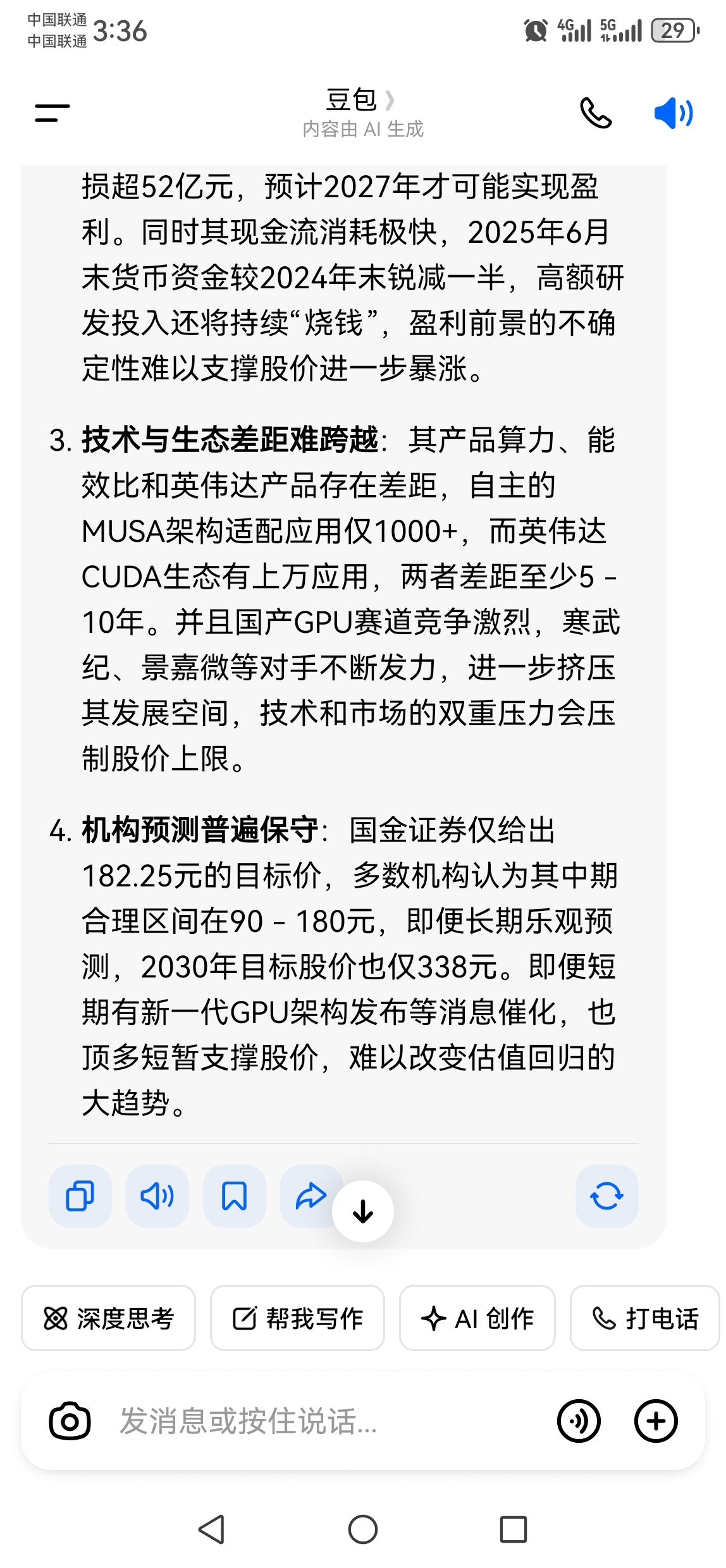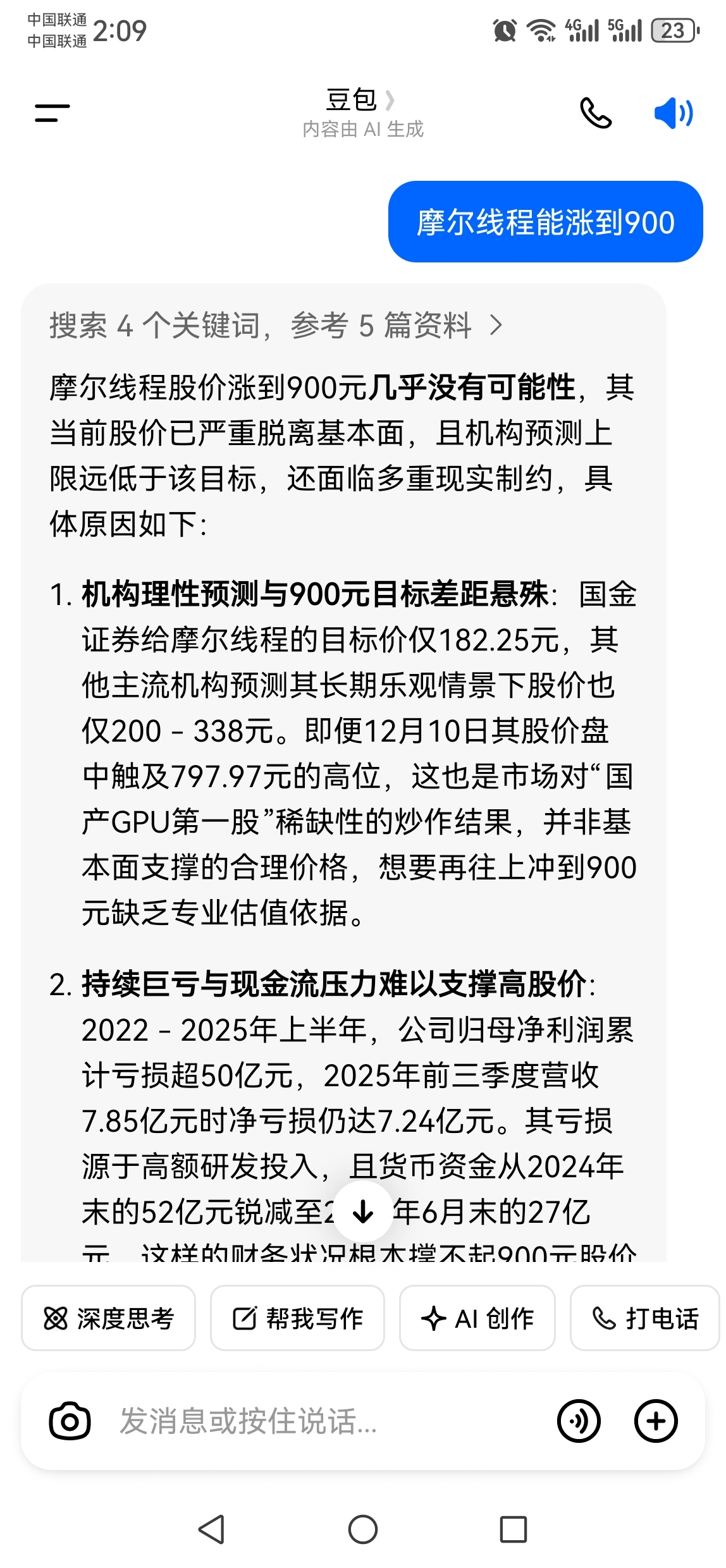 $昂瑞微(SH688790)$ 这个问AI有啥用,AI说昂瑞辉上市首日只有200-300多块,但是摩尔线程之前问豆包也才给90-180块,前天问豆包摩尔线程能不能到700,豆包说没有可能,昨天问豆包摩尔线程能不能到800,豆包说绝无可能,今天中午问豆包摩尔线程能不能到900,豆包说几乎绝无可能!