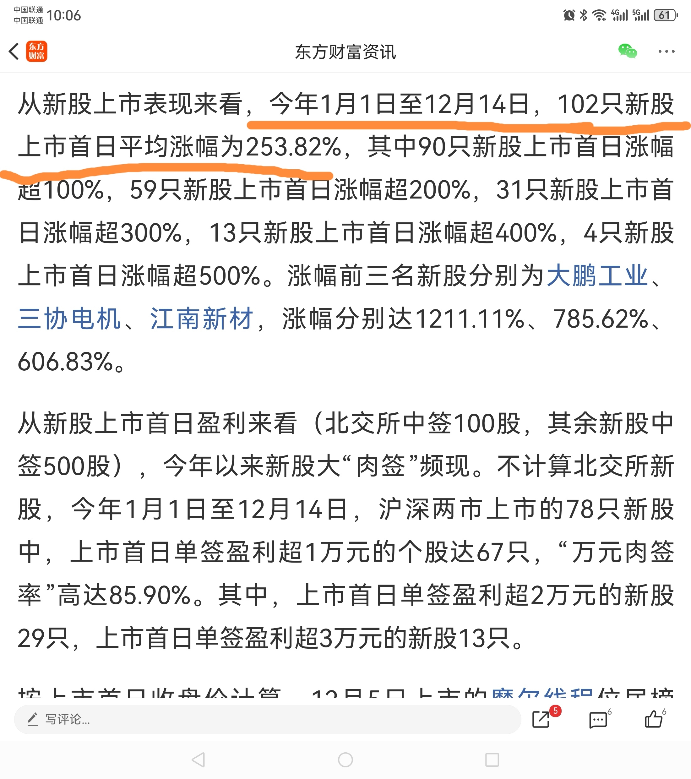 今年新股上市首日平均涨幅是253.82%,除掉拖后腿的冷门股比如医药之类的,科技