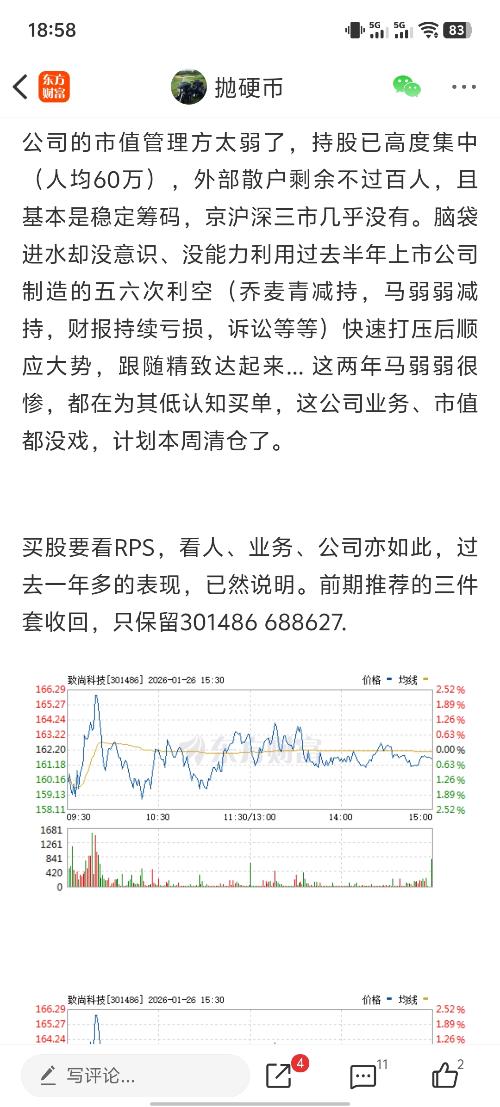 公司的市值管理方太弱了,持股已高度集中(人均60万),外部散户剩余不过百人,且基本是稳定筹码,京沪深三市几乎没有。脑袋进水却没意识、没能力利用过去半年上市公司制造的五六次利空(乔麦青减持,马弱弱减持,财报持续亏损,诉讼等等)快速打压后顺应大势,跟随精致达起来... 这两年马弱弱很惨,都在为其低认知买单,这公司业务、市值都没戏,计划本周清仓了。