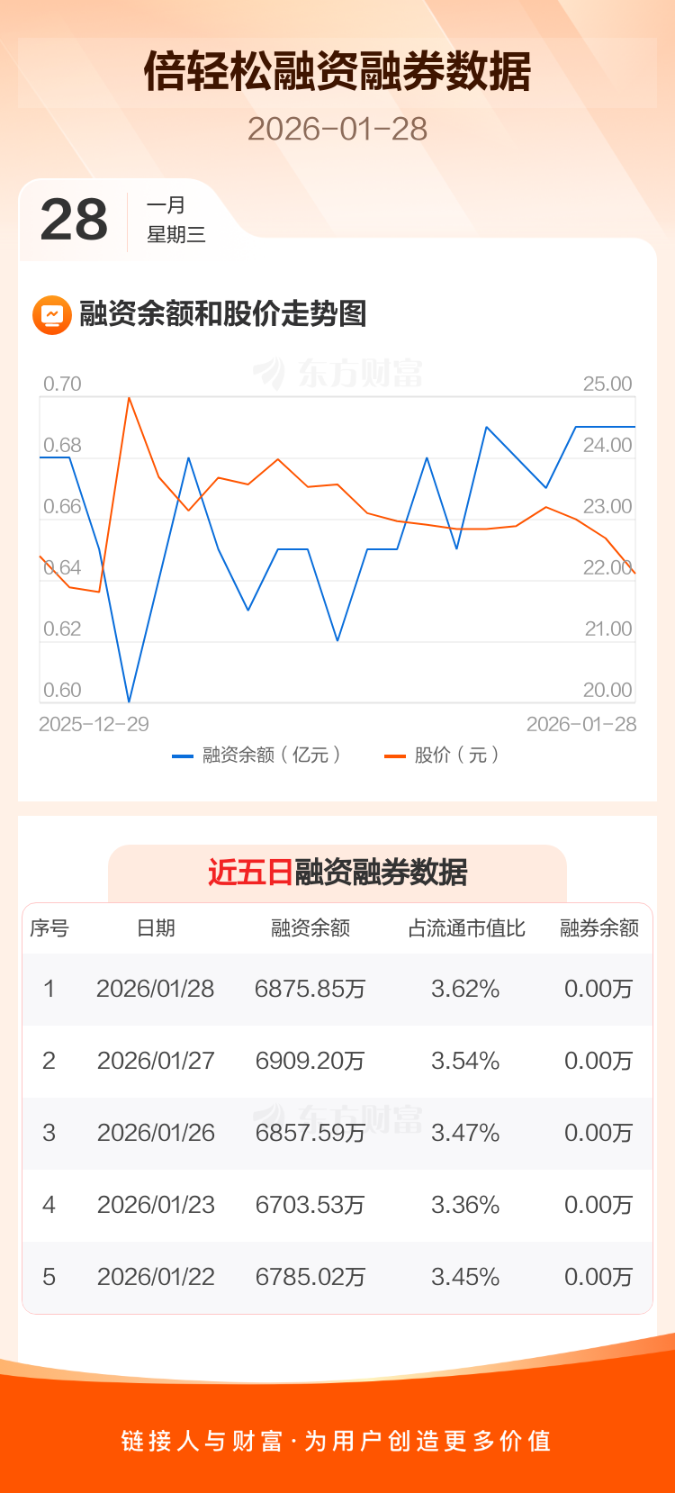 交易所最新数据显示,倍轻松于2026年1月28日获融资买入324.33万元,融资偿还357.67万元,当日融资净偿还33.35万元。目前,该股融资余额6875.85万,占流通市值比例为3.62%。