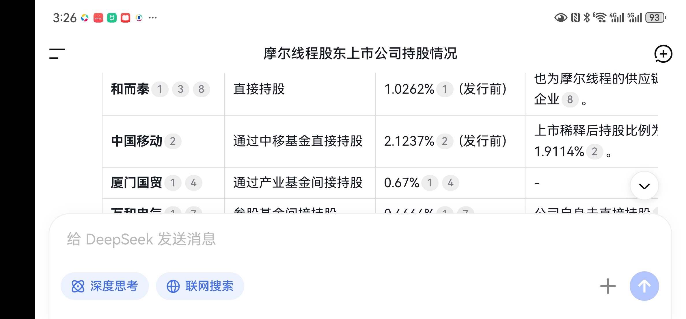 $摩尔线程(SH688795)$ 摩尔线程影子股持股第一名和而泰1.07%总市值超400亿市盈率超100倍,第二名厦门国贸持股0.67%总市值160亿市净率0.74倍市盈率18倍将接过福建板块龙头地位。