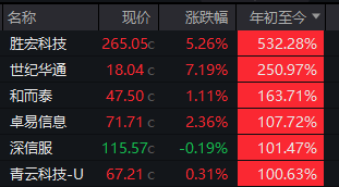 事实上,随着摩尔线程上市进程持续,A股市场的部分“摩尔线程概念股”也受到了市场关注。Wind数据显示,自今年年初至今,A股摩尔线程指数已整体上涨超90%。从个股年初至今的累计涨幅来看,胜宏科技涨超500%,世纪华通涨超250%,和而泰、卓易信息、深信服等多股股价翻番。