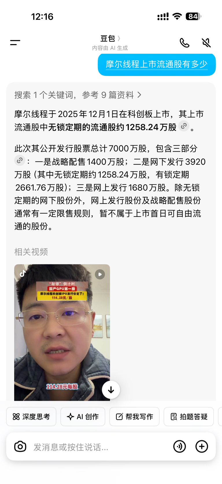 $摩尔线程(SH688795)$ 豆包回复上市流通股只有1258万股,其余配售的都是限售股,实际确切的多少?