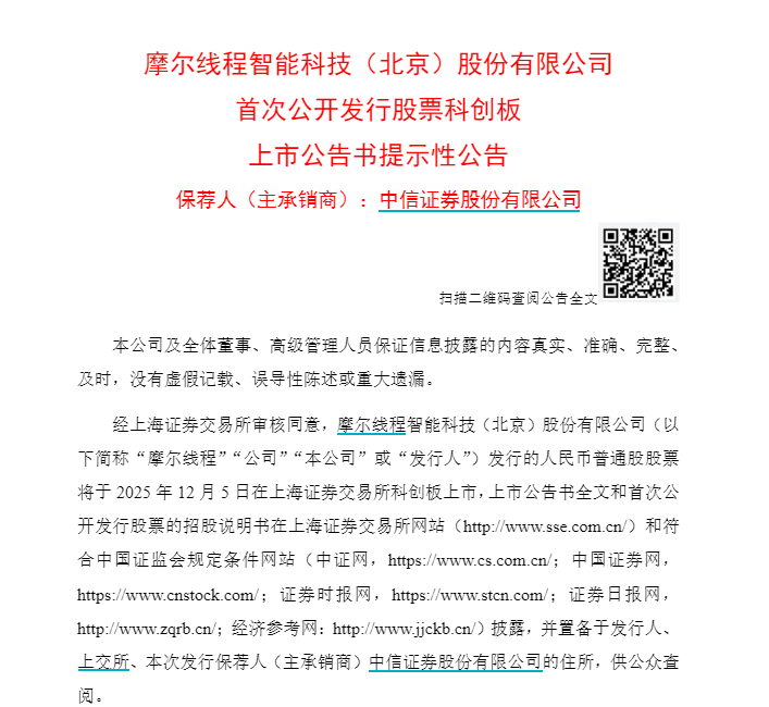 12月3日晚间,摩尔线程(688795)发布公告称,公司股票将于2025年12月5日(周五)在上海证券交易所科创板上市。