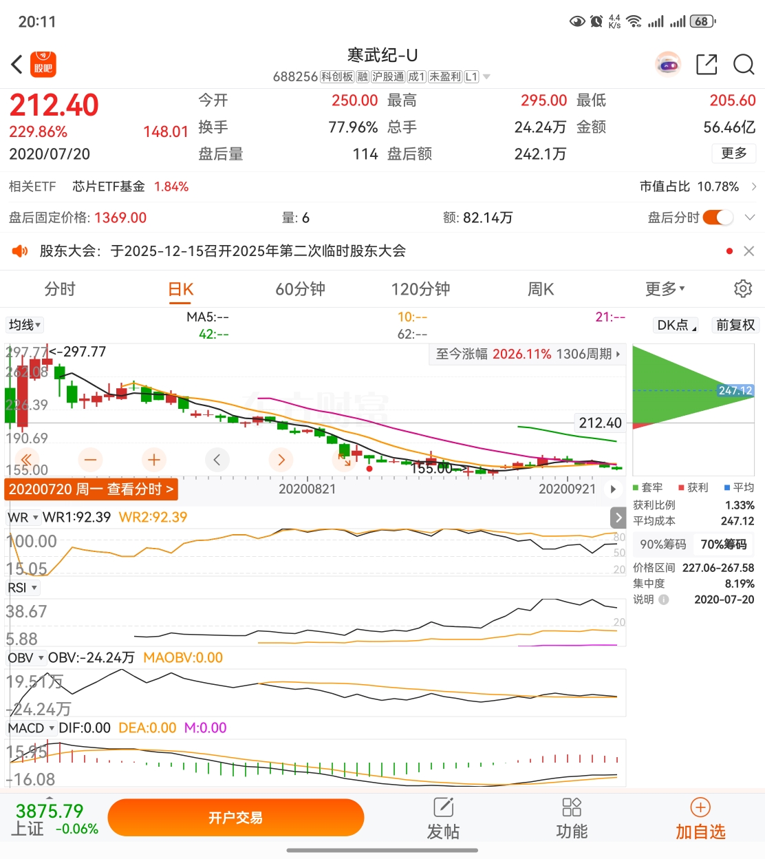 随手翻了一下2020年7月20日寒武纪上市当天的走势。和后面很长一段时间的中期走