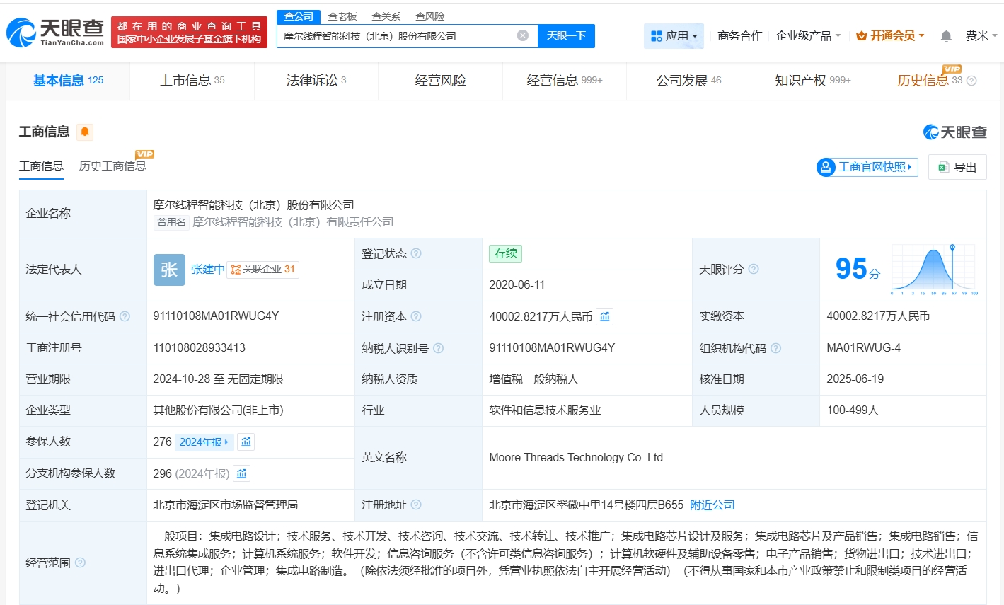 摩尔线程已于12月5日登陆科创板,发行价114.28元/股,为A股近一年来上市新股最高。本次公开发行7000万股新股,发行后总股本为4.7亿股,其上市首日开盘报650.00元/股,涨幅468.78%,中一签可赚超26万元。天眼查App显示,摩尔线程关联公司摩尔线程智能科技(北京)股份有限公司成立于2020年6月,法定代表人为张建中,注册资本约4亿人民币,经营范围包括集成电路设计、集成电路芯片设计及服务、集成电路芯片及产品销售等,由南京神傲管理咨询合伙企业(有限合伙)、张建中、杭州华傲管理咨询合伙企业(有限合伙)等共同持股。对外投资信息显示,该公司对外投资10余家存续企业,包括北京数道智算科技有限公司、光速摩方智能科技(广东横琴)有限责任公司、北京摩笔生成科技有限公司等。