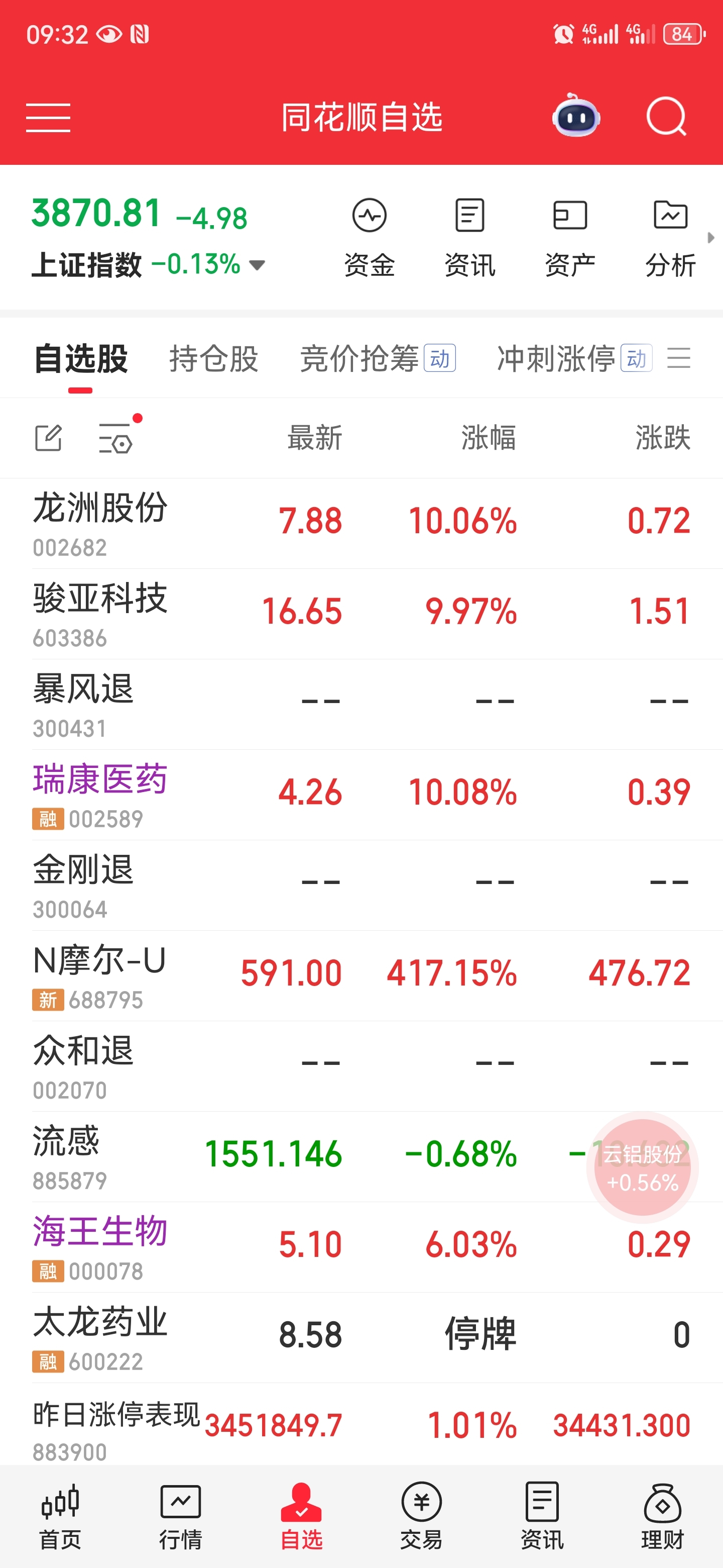 $N摩尔-U(SH688795)$ $瑞康医药(SZ002589)$ 12月5日0点:留强去弱,卖出止盈,避险一下。轻仓分仓买靠前排的,低吸+打回封。1.单点全仓瑞康医药,恭喜吃肉。2.一进2,龙洲股份(pk骏亚科技)。3.海王生物,安记食品(海欣食品)盯板吃肉。收工。