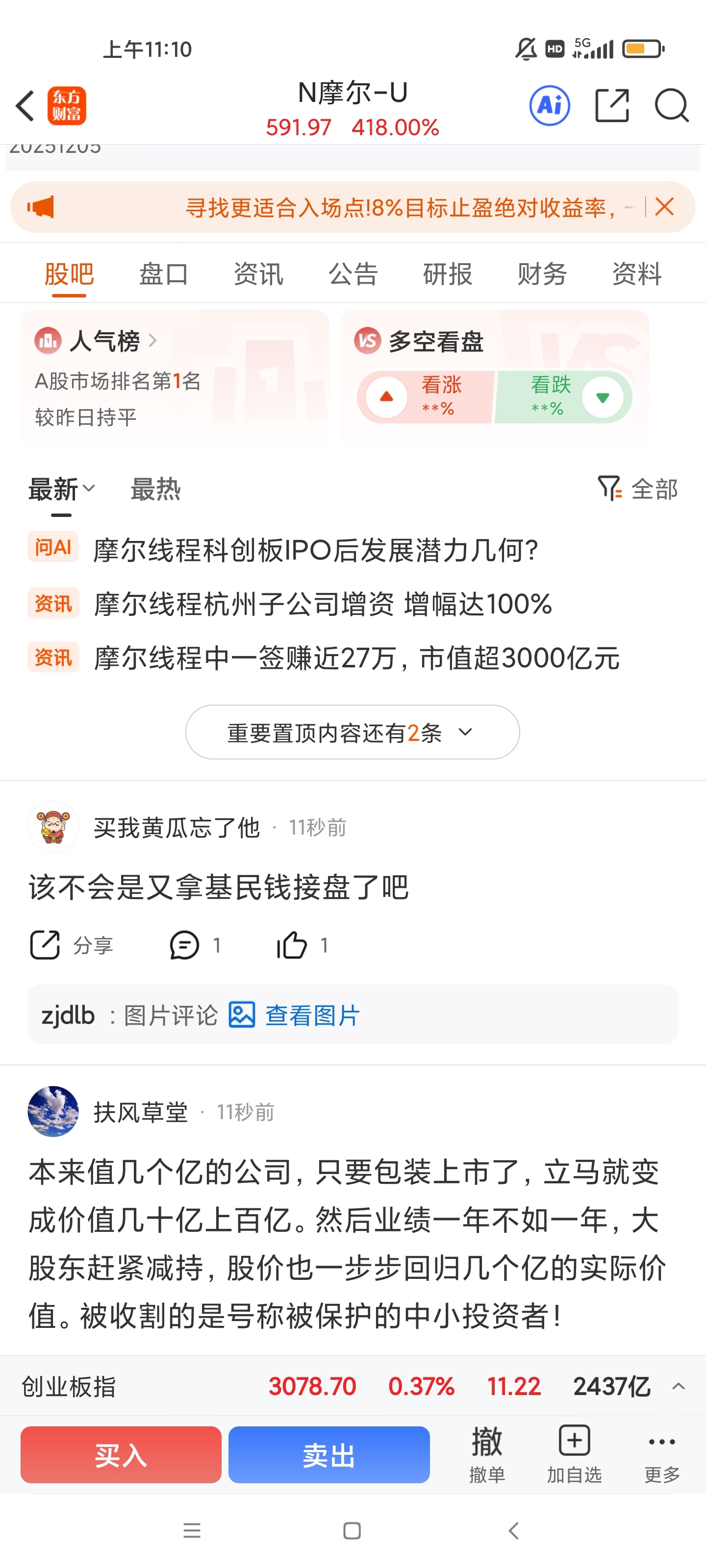 $N摩尔-U(SH688795)$ 看到利好就要卖出,这帮人够坏。而且新根本没性价比,50还差不多,当时寒武纪我就是叫我朋友50抄底的,摩尔我也50来买