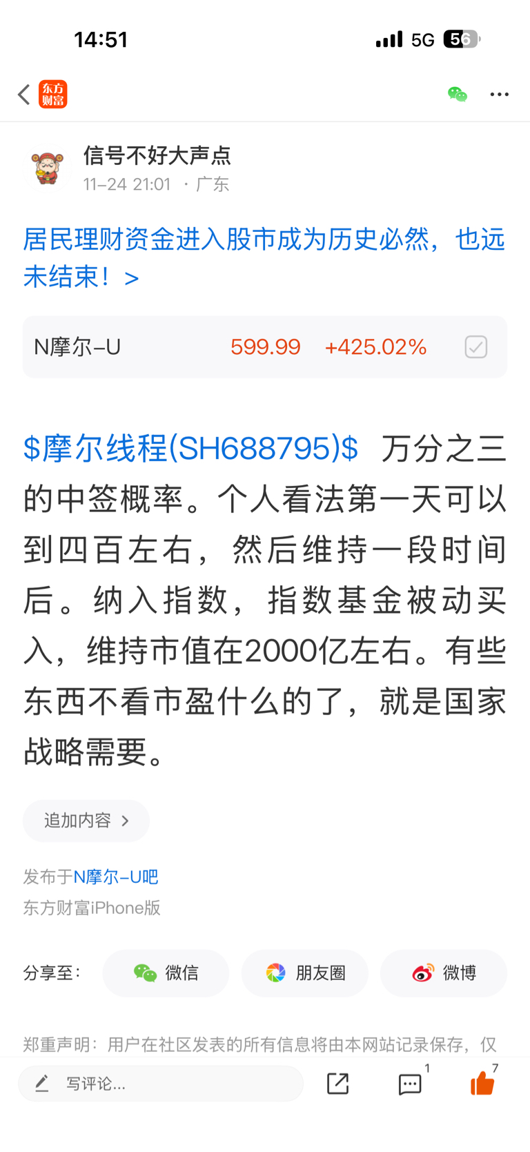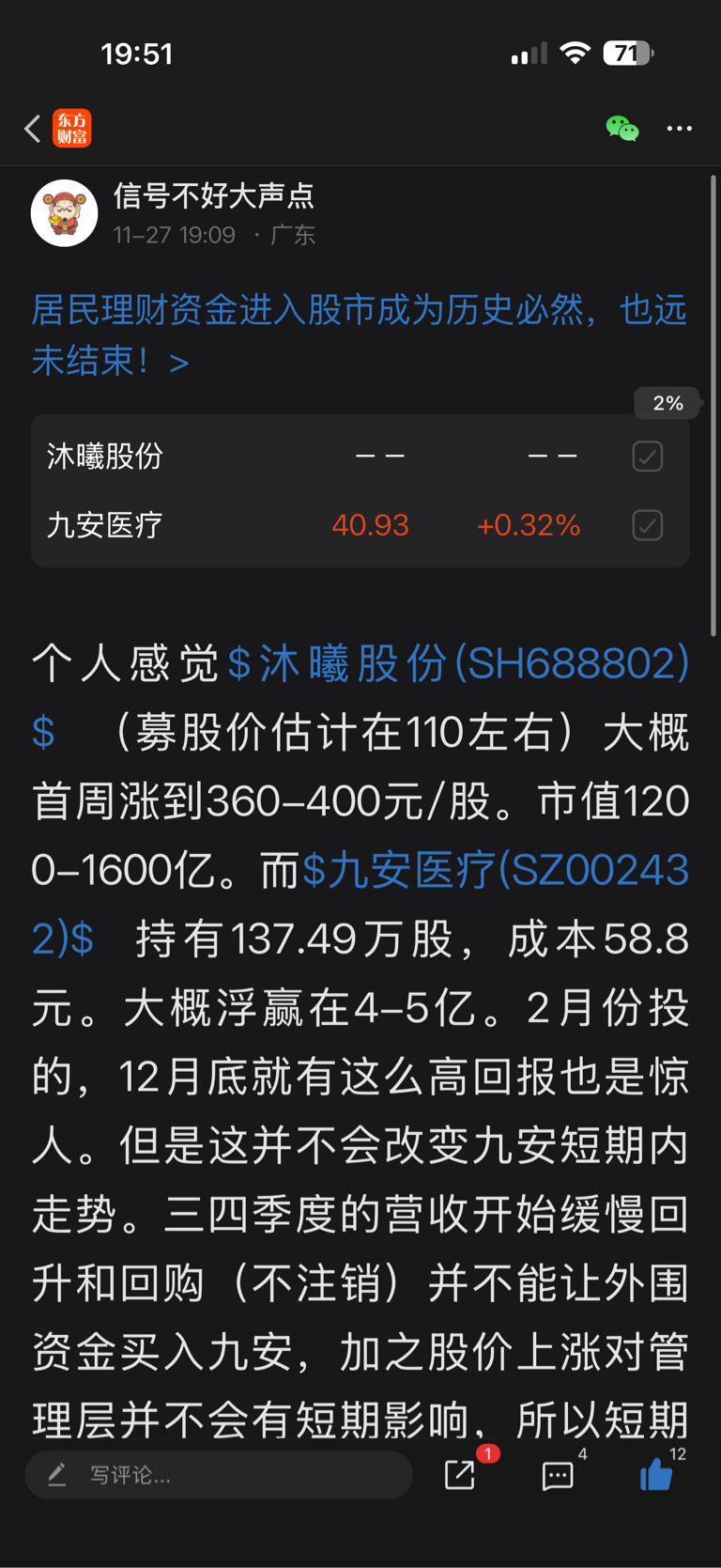$N摩尔-U(SH688795)$ 第一天超预期的股价,证明大机构的定价权。$沐曦股份(SH688802)$ 证明到时候沐曦首日上市也不会低过我的预期。$九安医疗(SZ002432)$ 九安的走势也符合我的预期,至于后面的走势也已经私聊跟一部份股友说过,看来也是大概率的事情。
