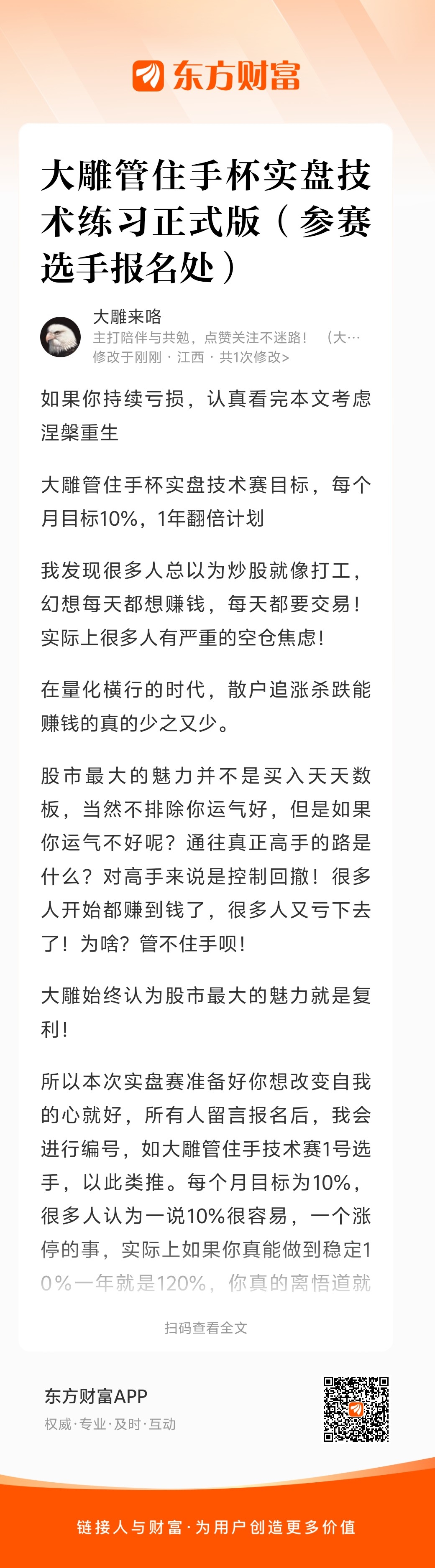 温馨提示: 1.根据《证券法》规定,禁止编造、传播虚假信息或者误导性信息,扰乱证券市场;2.用户在本社区发表的所有资料、言论等仅代表个人观点,与本网站立场无关,不对您构成任何投资建议。用户应基于自己的独立判断,自行决定证券投资并承担相应风险。《东方财富社区管理规定》