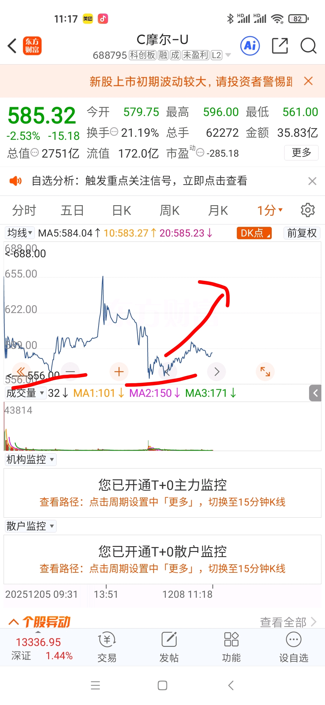 $C摩尔-U(SH688795)$ 从图形走势来看,双底已构筑,空头黑子就闭嘴吧!等着大涨!