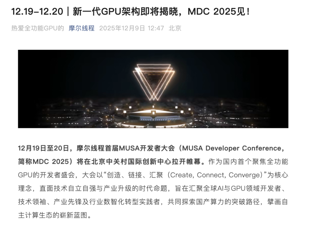 12月9日,摩尔线程发布消息称,12月19日至20日,摩尔线程首届MUSA开发者大会(MUSA Developer Conference,简称MDC 2025)将在北京中关村国际创新中心拉开帷幕。
