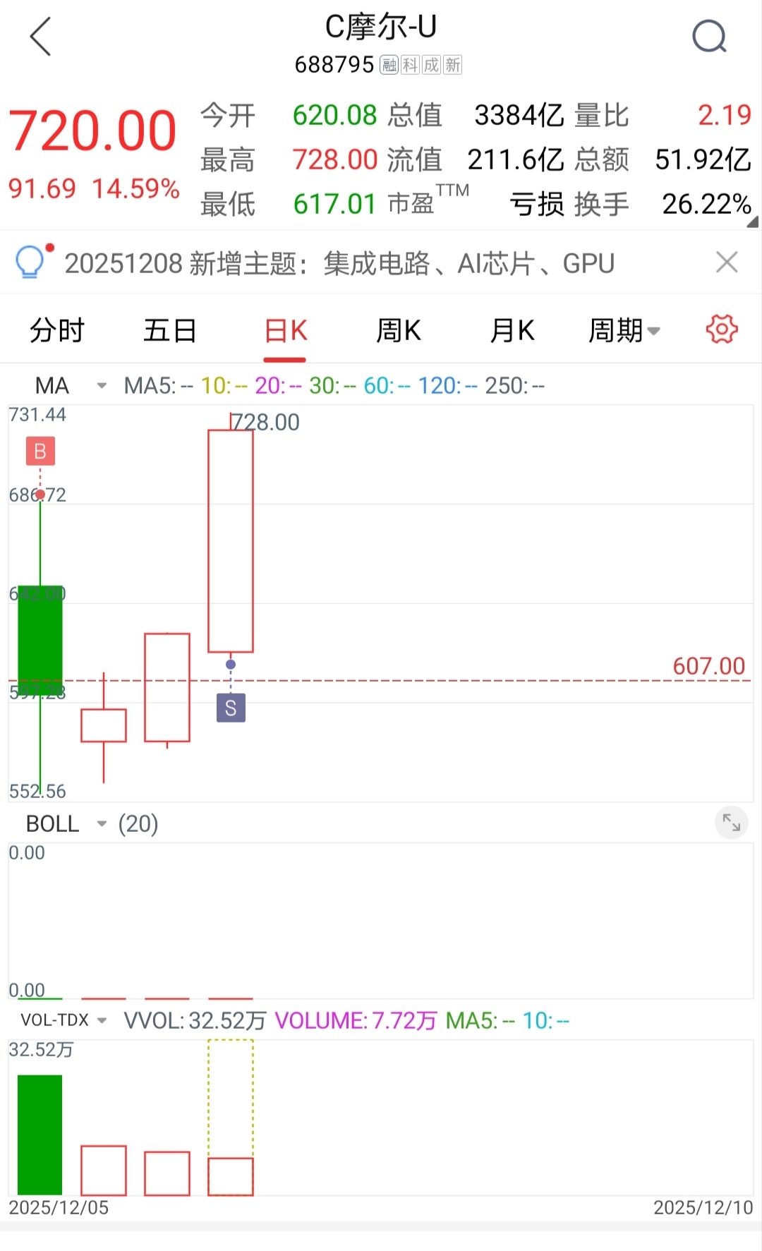 支持中国英伟达。虽没中签,上市第一天在607元买入500股,今天均价680元卖出