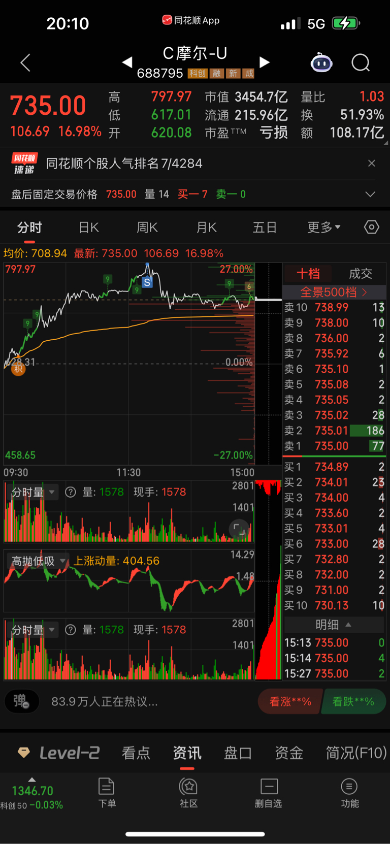 感谢主力,感谢家人们,吃肉跑了,瞄准795跑的,看到那个代码688,第一天最高价,一到795,本来我就卖出,买的不多,5手就够吃肉了估计还会冲击1000元,甚至寒王股价!!我怕了,先下车了啊,祝大家赚大钱