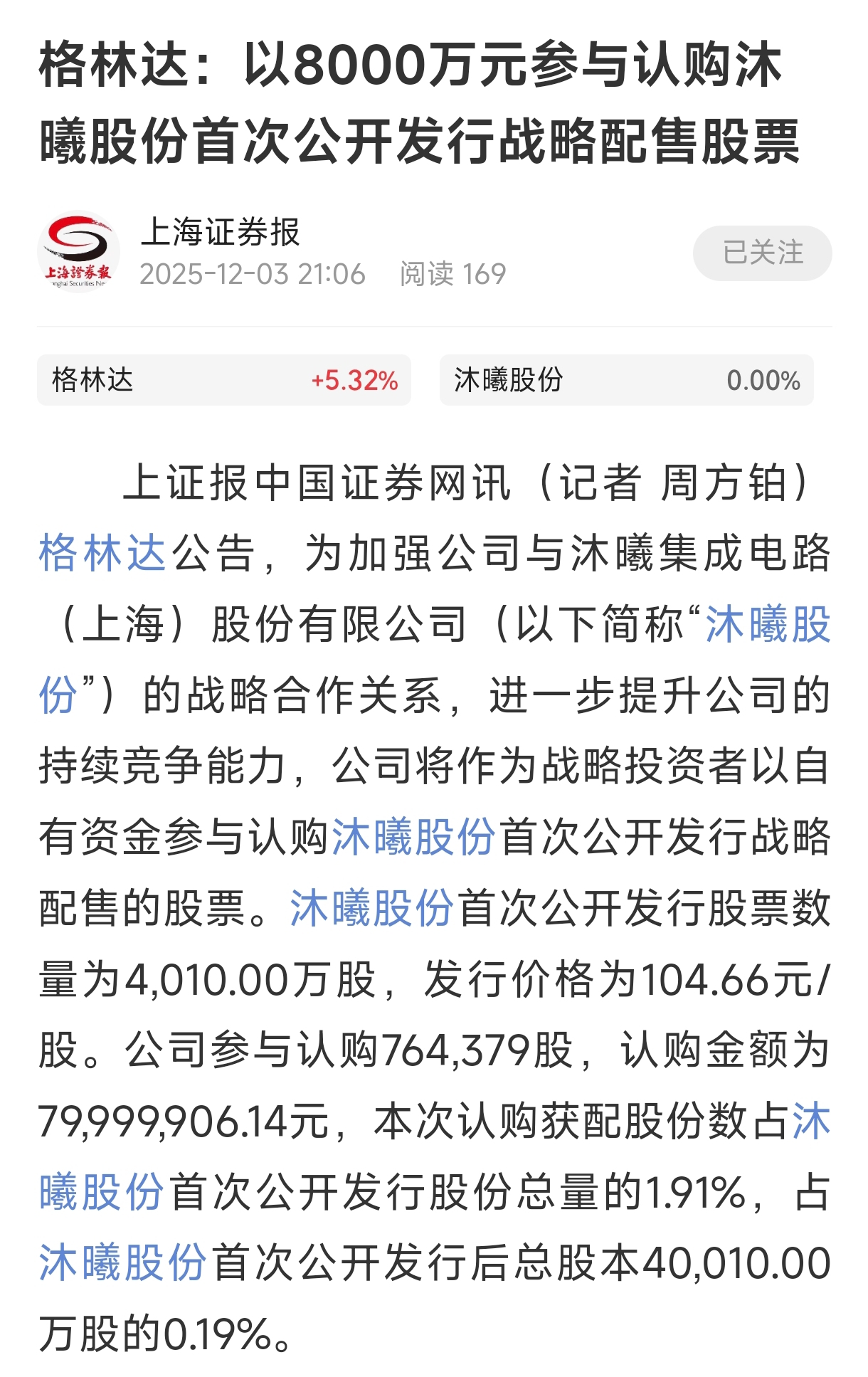 #强势机会# $沐曦股份(SH688802)$ 猜猜沐曦股份上市开盘价多少?重点关注 格林达:以8000万元参与认购沐曦股份首次公开发行战略配售股票