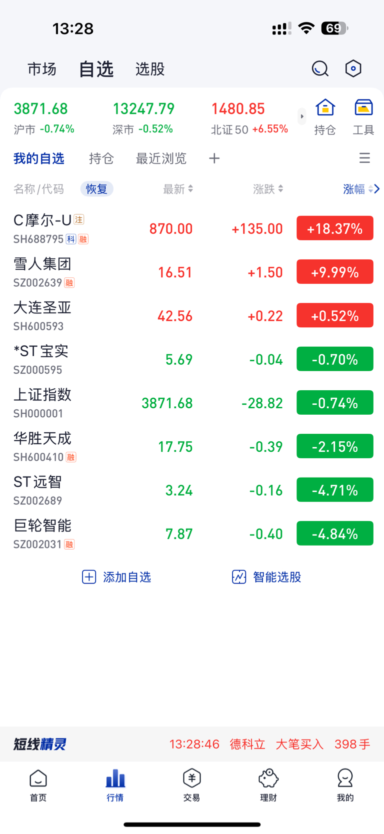 自选三红,运气而已,最近市场每天4000+下跌,那些走势良好的个股在这种氛围中被