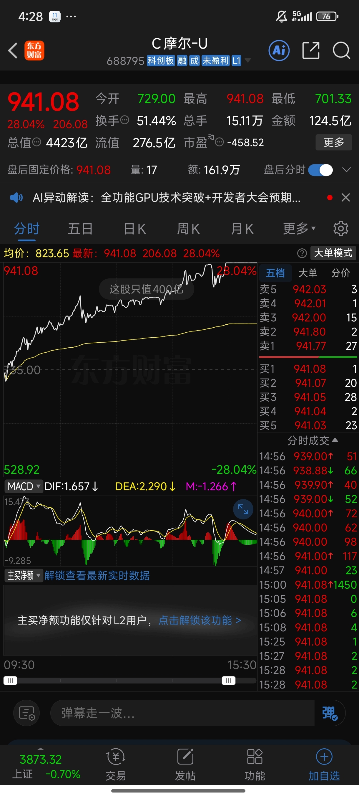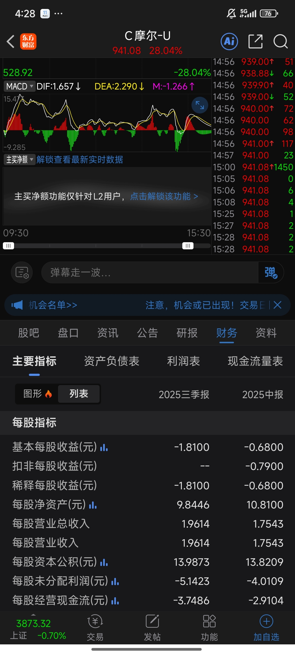 $C摩尔-U(SH688795)$ 此股股价九百多,净资产九块多,三季度爆亏一块多,用不了半年,公司就得破产!现在净资产打个三折,此股值三块,半年后,净资产归零,此股值一分!一年后,净资产为负数,资不抵债!股价只所以,无脑冲入!是那些机构经理们收了好处,高价位接盘!此股有可能高达2000多一股,超过寒武纪!这种现家说明什么?说明股市不缺资金!