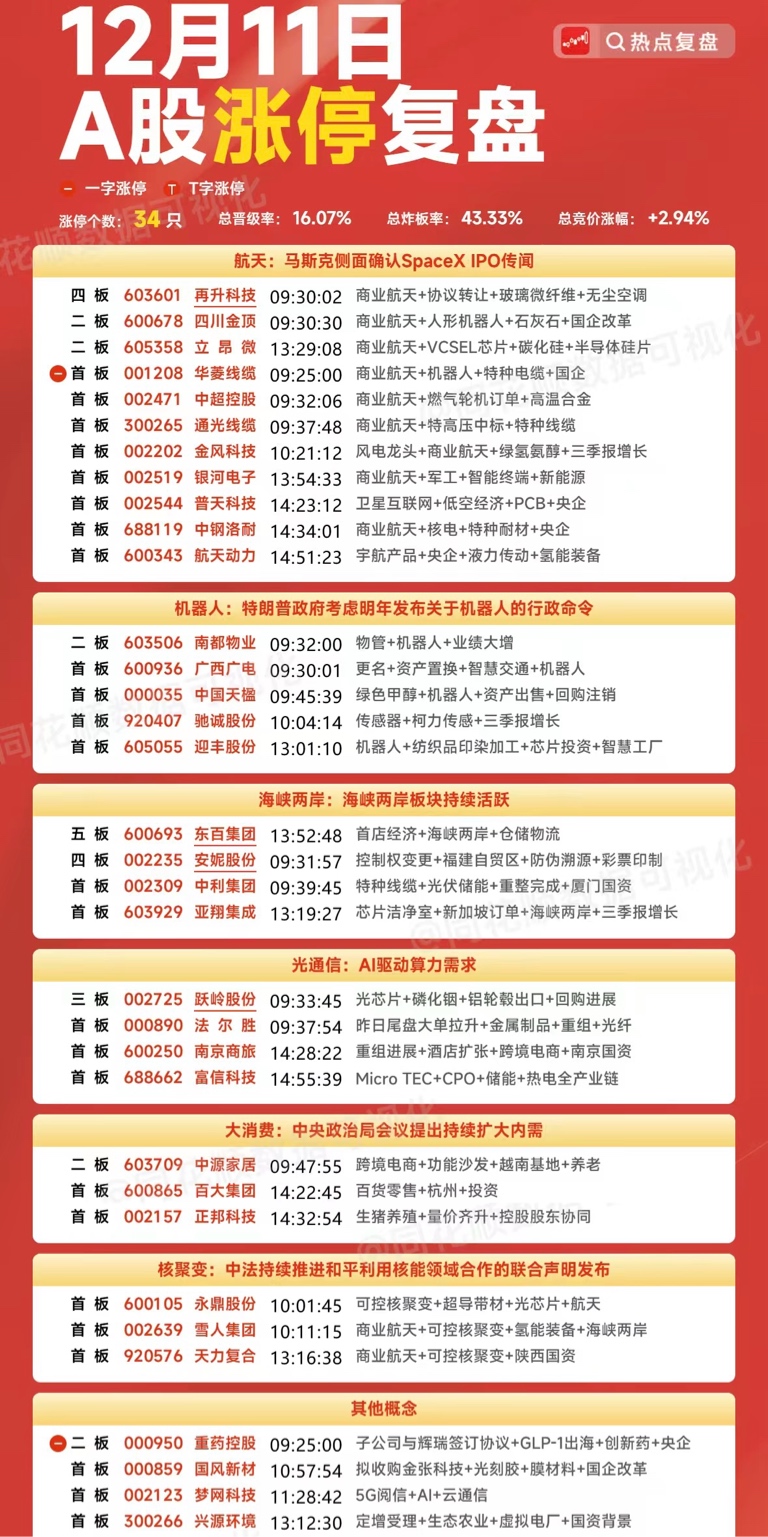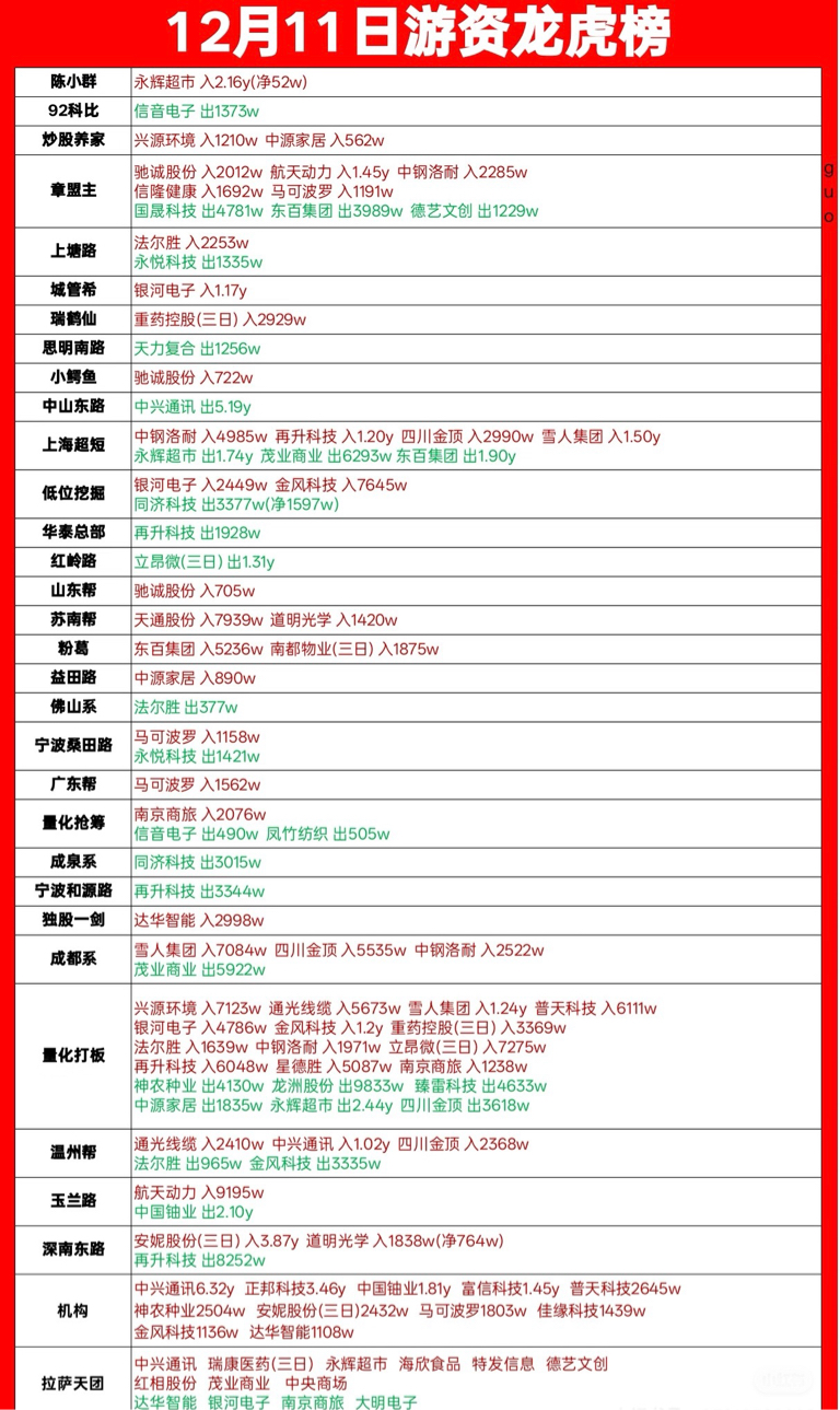 12月11日 游资龙虎榜&各大板块涨停个股复盘