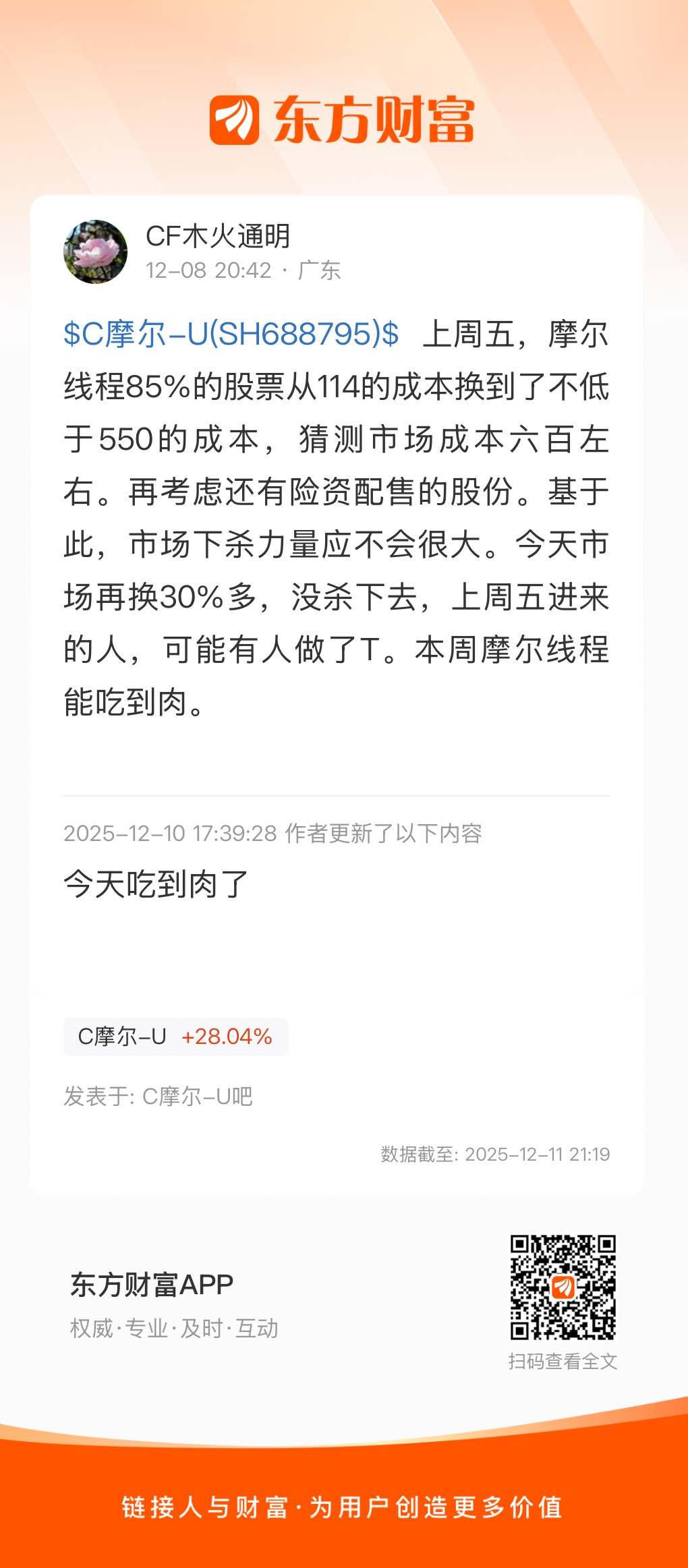 $C摩尔-U(SH688795)$ 上周五,摩尔线程85%的股票从114的成本换到了不低于550的成本,猜测市场成本六百左右。再考虑还有险资配售的股份。基于此,市场下杀力量应不会很大。今天市场再换30%多,没杀下去,上周五进来的人,可能有人做了T。本周摩尔线程能吃到肉。