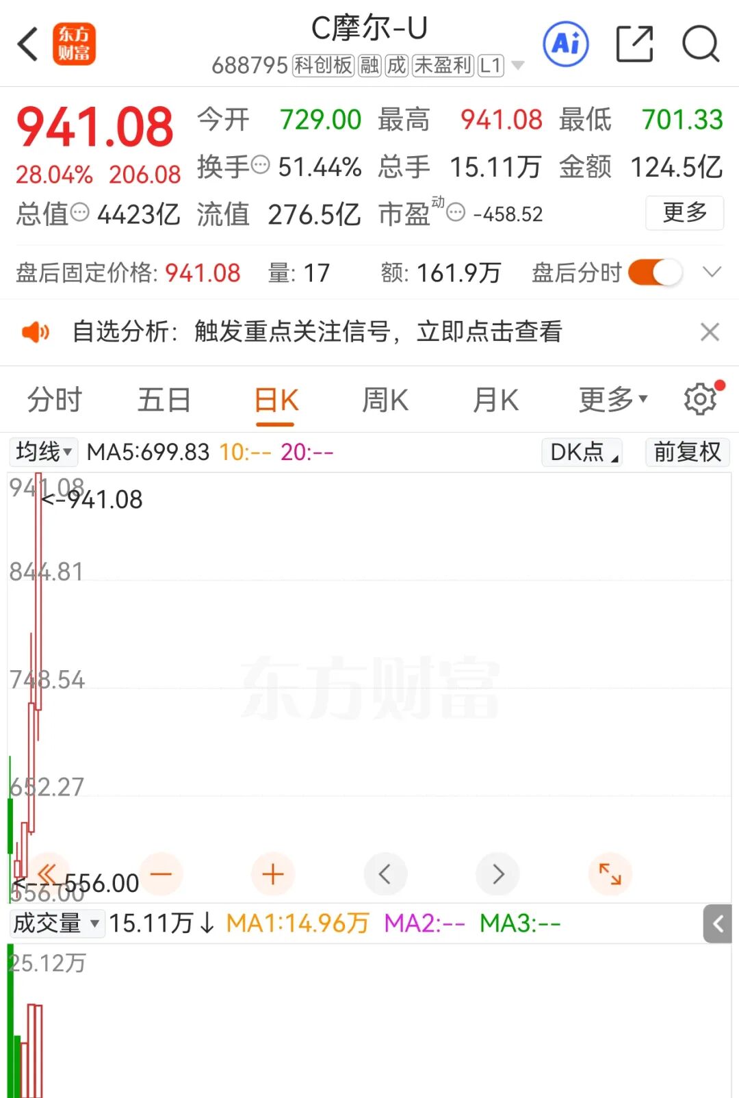 12月11日,GPU龙头企业摩尔线程大涨28%,总市值突破4400亿元,再创上市以来新高。自12月5日上市以来,摩尔线程股价累计涨幅超过700%。摩尔线程股价的大涨,让打新中签的投资者爆赚。如果投资者中签摩尔线程新股且至今未卖出,按11日收盘价941.08元/股计算,单签浮盈将超过41万元。