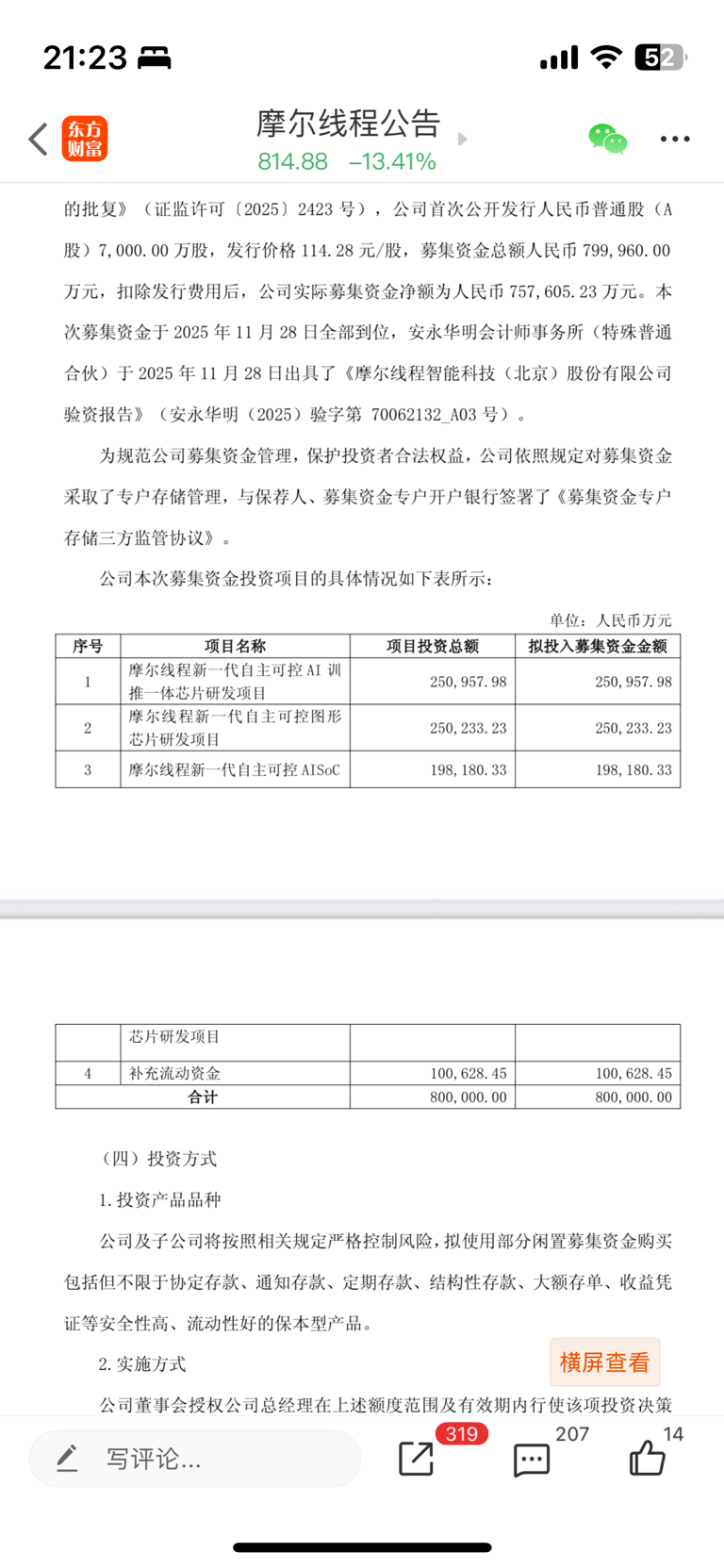 $摩尔线程-U(SH688795)$ 看了一圈股吧 感觉没一个人通篇看全公告 我只想说公告里这个表格有人看过吗? 公司只是提高资金利用率 其中70亿左右的项目投资是有规划明细表的。