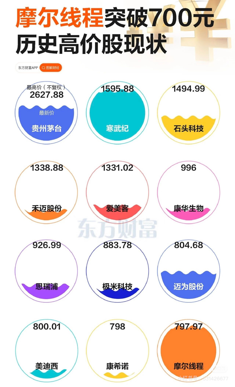 $摩尔线程-U(SH688795)$ 现在这价格还低,看看下图这些高价股,大部分都是上市后一两个月才到达历史高点,摩尔肯定还能涨,1500高点,不信两个月后来看,这票不是普通散户能买的,拉到高位进ETF指数接盘