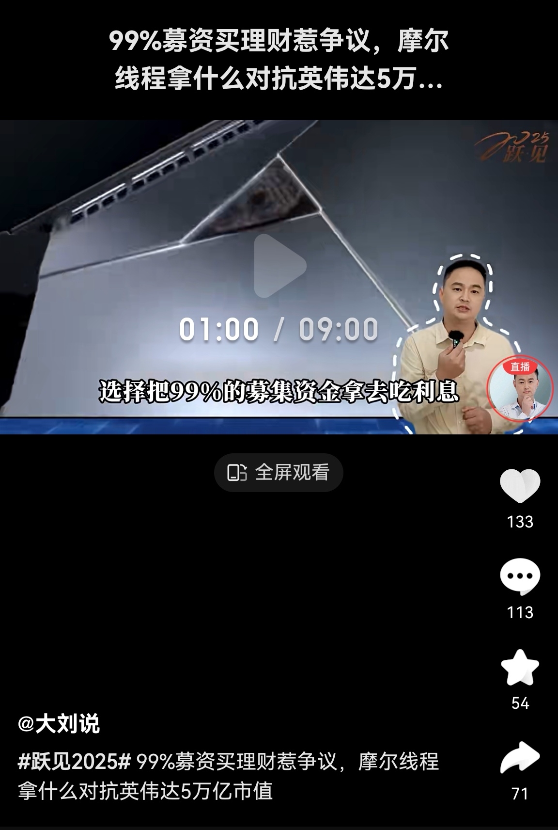 张建中辜负了国家的信任,辜负了股民的期待。英伟达市值已经突破5万亿美元,张建中还在为摩尔——15亿年营收——61%毛利率——4000亿高估值——75亿理财资金——2亿元/年的理财收入——而沾沾自喜——试问摩尔拿什么对抗5万亿美元的英伟达?