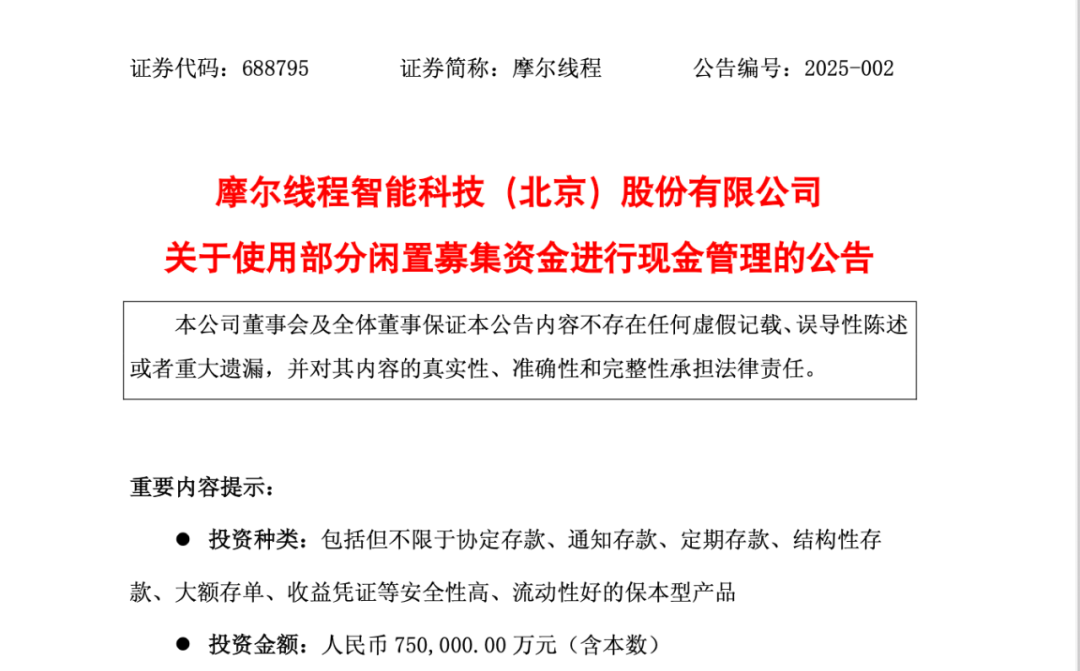 12月12日,“国产GPU(图形处理器)第一股”摩尔线程发布公告,公司及实施募投项目的子公司计划使用最高不超过75亿元(含本数)的闲置募集资金进行现金管理。购买包括但不限于协定存款、通知存款、定期存款、结构性存款、大额存单、收益凭证等安全性高、流动性好的保本型产品。