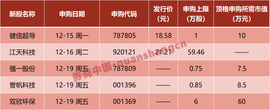 本周(12月15日—12月19日)有5只新股发行。周一:健信超导;周二:江天科技;周五:强一股份、誉帆科技、双欣环保。