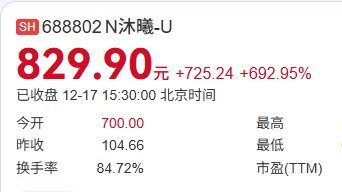 摩尔止跌,明天可能大量资金进场。沐曦股份收涨830元