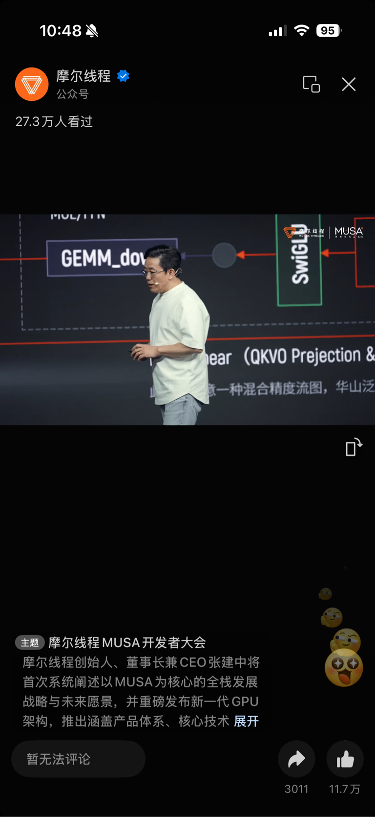 $摩尔线程-U(SH688795)$ 摩尔线程新卡出来了,对标B200,新架构实现DLSS和RTX功能。目前张建中正在直播!周一大涨!