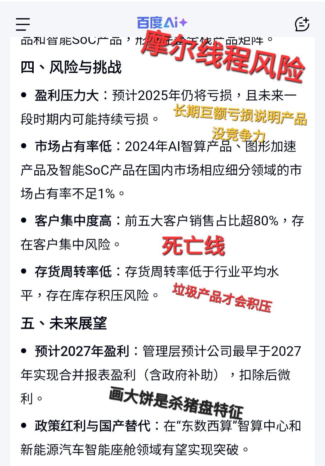 $摩尔线程-U(SH688795)$ 摩尔线程高分险分析。。产品单一挤压说明没有创新能力,长期亏损更说明在挣扎。。没有光刻机不可能造1供不应求的高阶芯片。更不可能有市站率。客户单一说明风险高,说经营能力差。。。10元都不值
