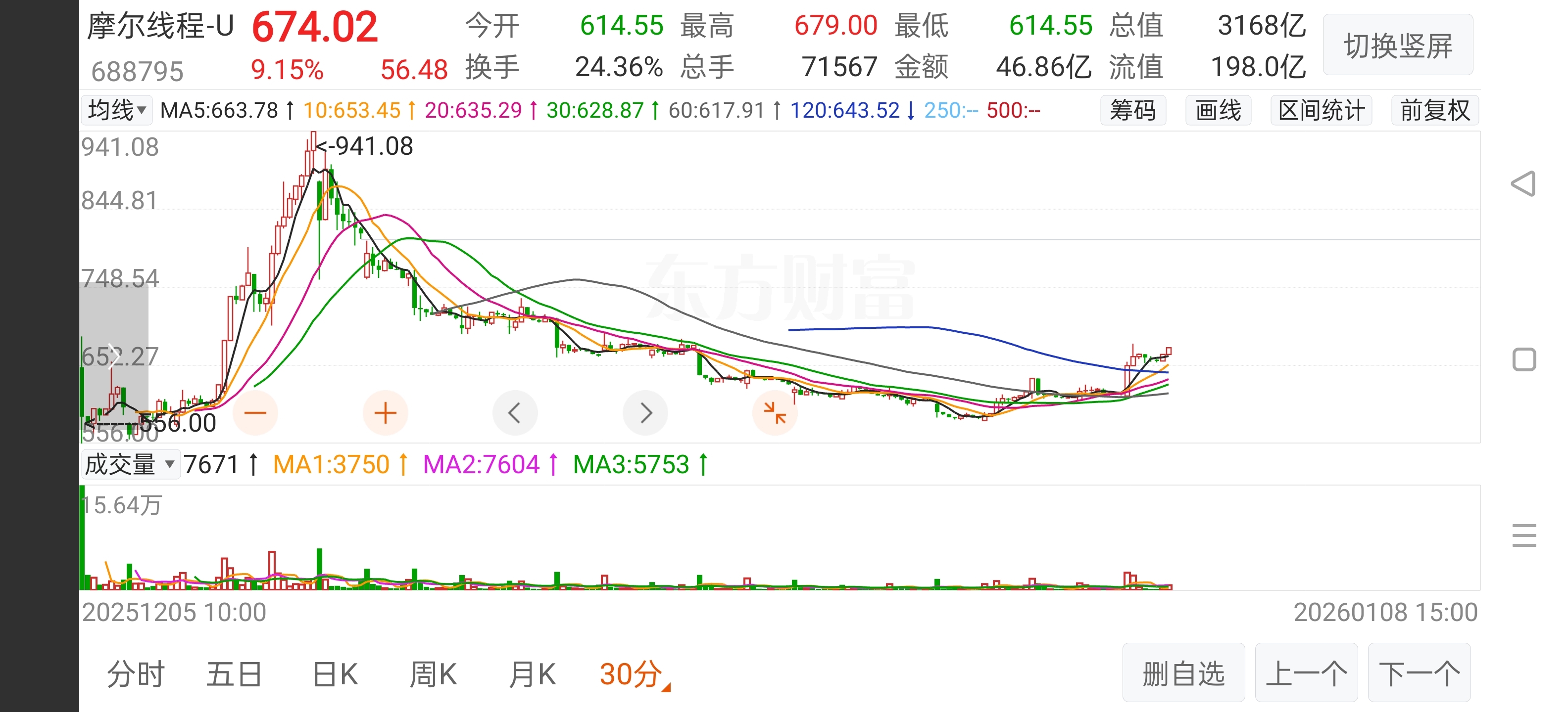 $摩尔线程-U(SH688795)$ 你看这个30分钟k线图标准的启动信号啊