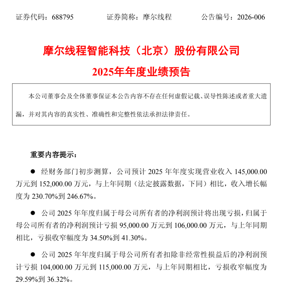 1月21日晚,号称“中国版英伟达”的摩尔线程发布2025年度业绩预告,公司2025年营收预计为14.50亿元至15.20亿元,较2024年增长230.70%至246.67%。2025年扣非净利润预计亏损10.40亿元至11.50亿元,与上年同期相比,亏损收窄幅度为29.59%到36.32%。