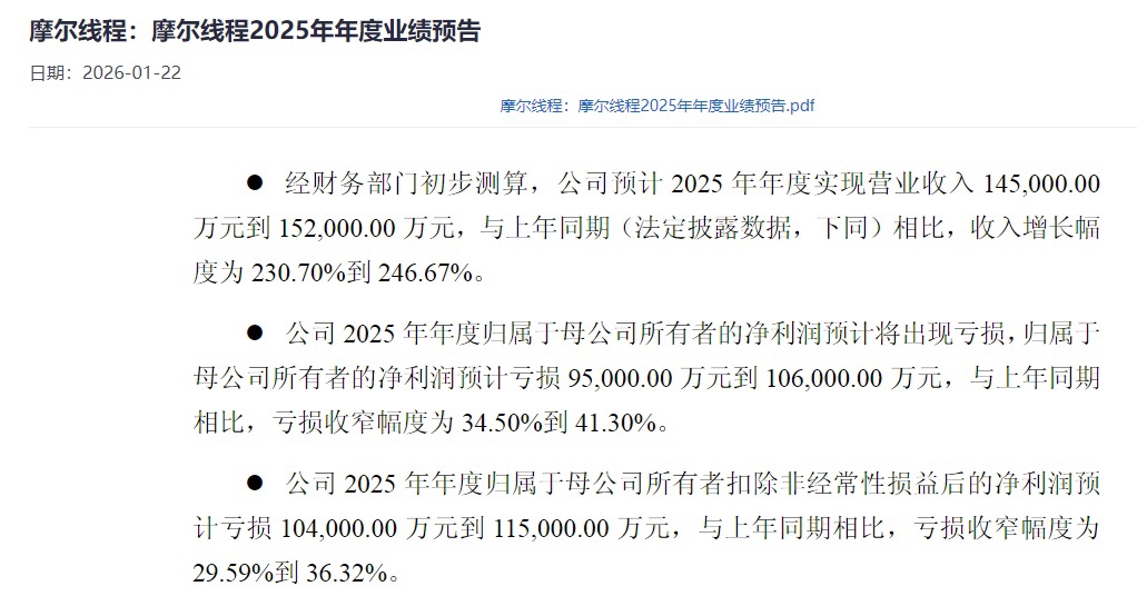 于2025年12月5日上市的GPU第一股摩尔线程-U(688795.SH),1月21日晚间发布了上市以来的首份年度业绩预告。