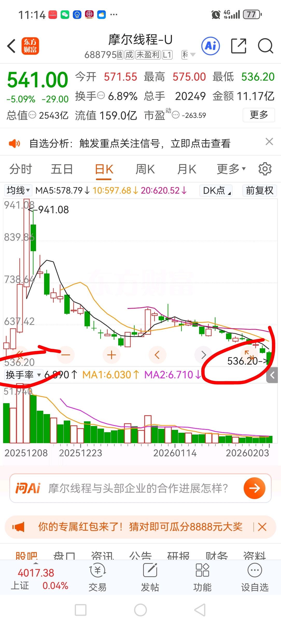 $摩尔线程-U(SH688795)$ 536.20和上市当天持平了!还要跌!