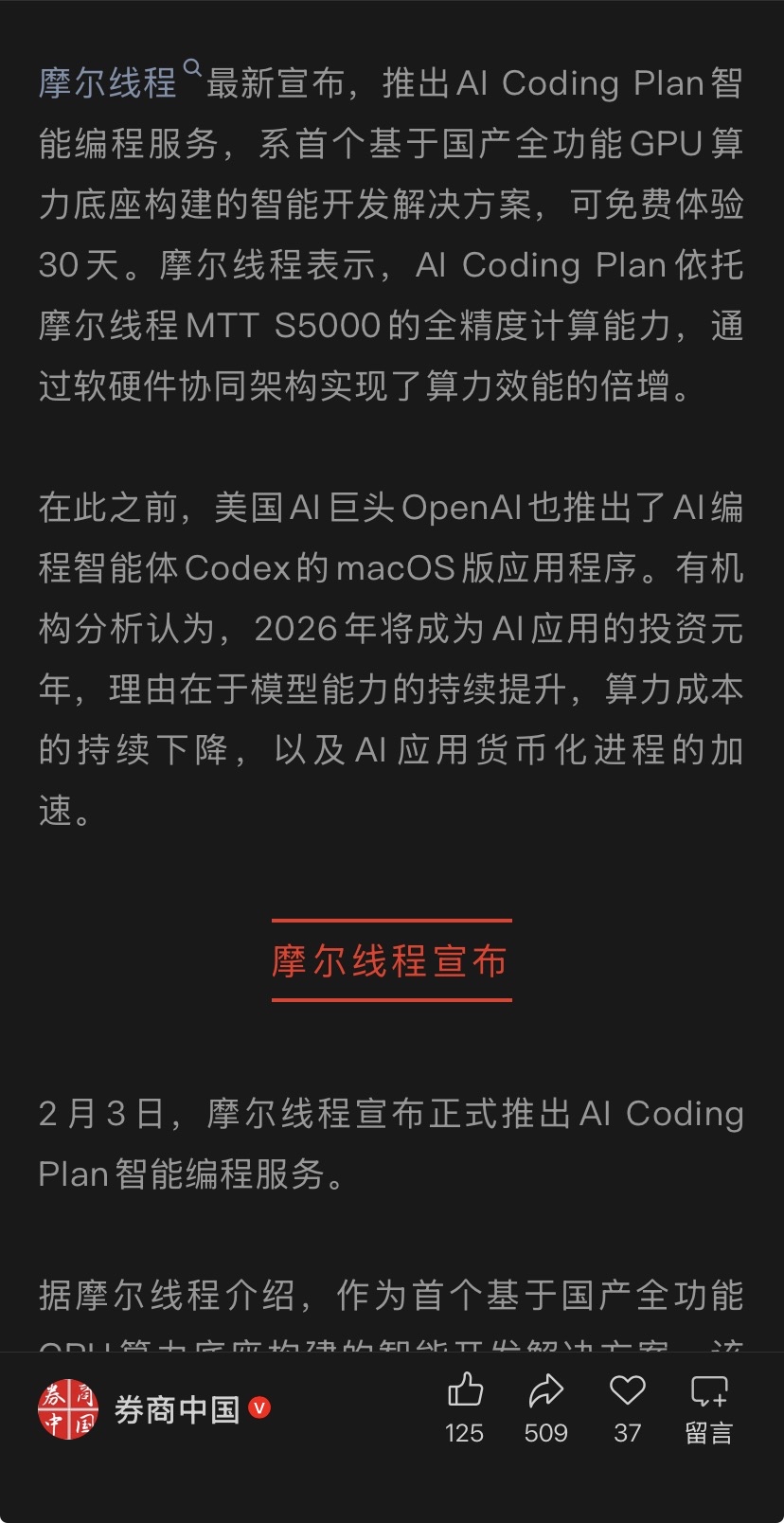 国内首个!摩尔线程,重大发布!等待涨上k哈