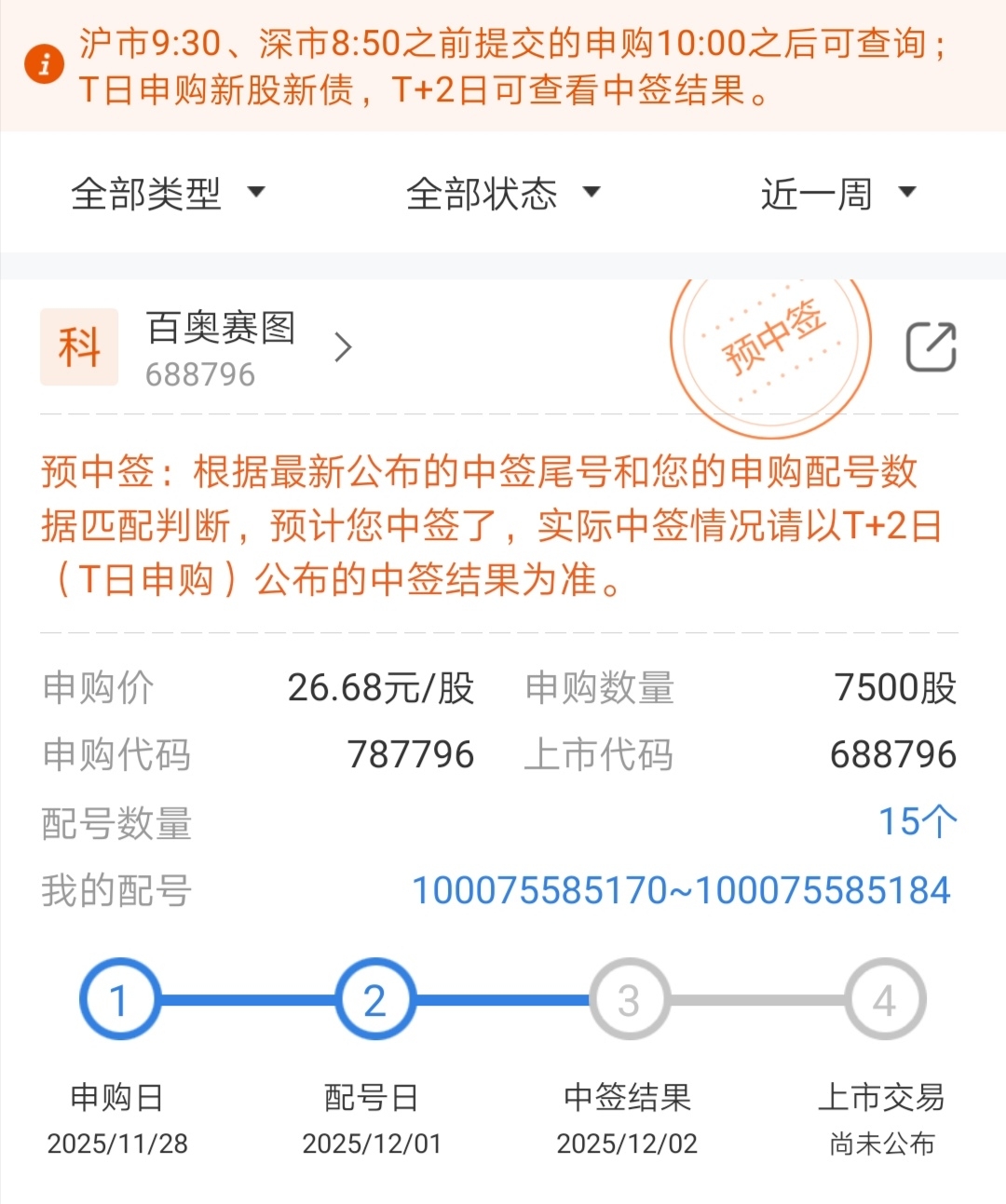 $百奥赛图(SH688796)$ 已收到中签短信,喜中一签,根据行业特点和盈利预期,保守估计可赚三万元