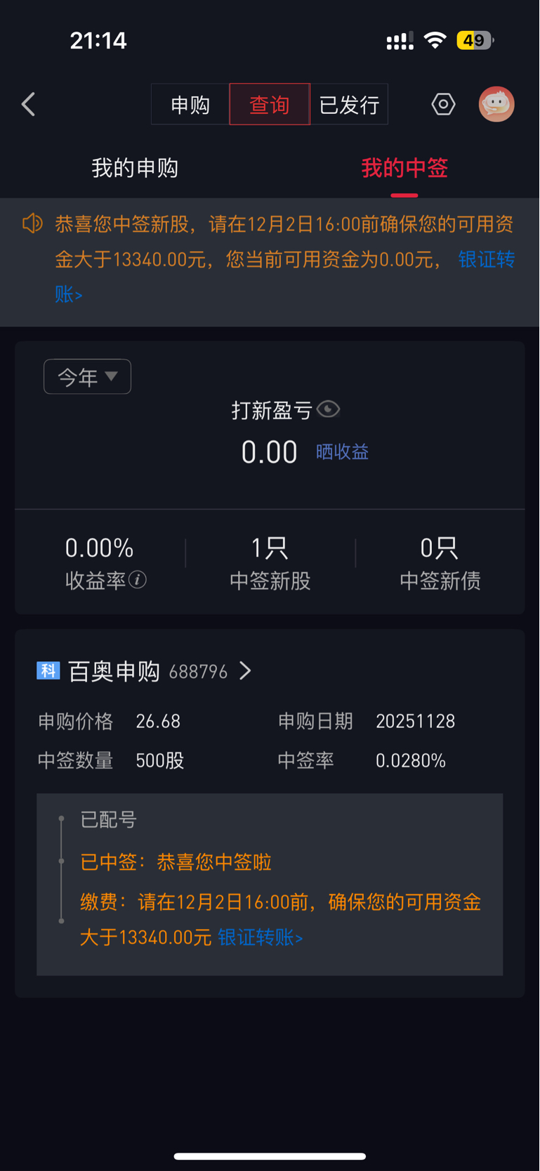 $百奥赛图(SH688796)$ 第一次中签,还是比较激动