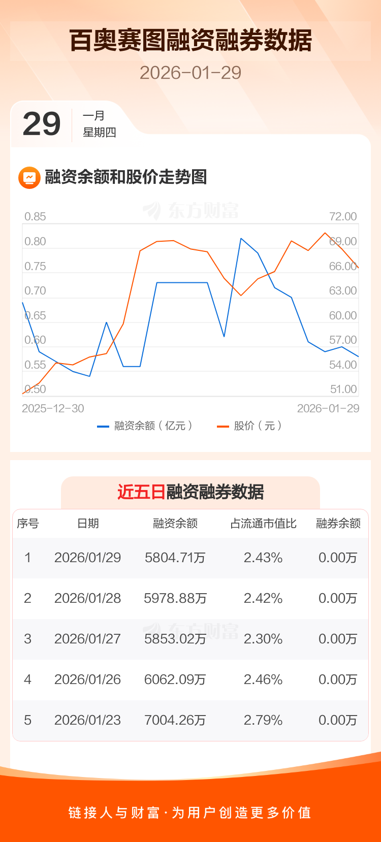 交易所最新数据显示,百奥赛图于2026年1月29日获融资买入657.81万元,融资偿还831.98万元,当日融资净偿还174.17万元。目前,该股融资余额5804.71万,占流通市值比例为2.43%。