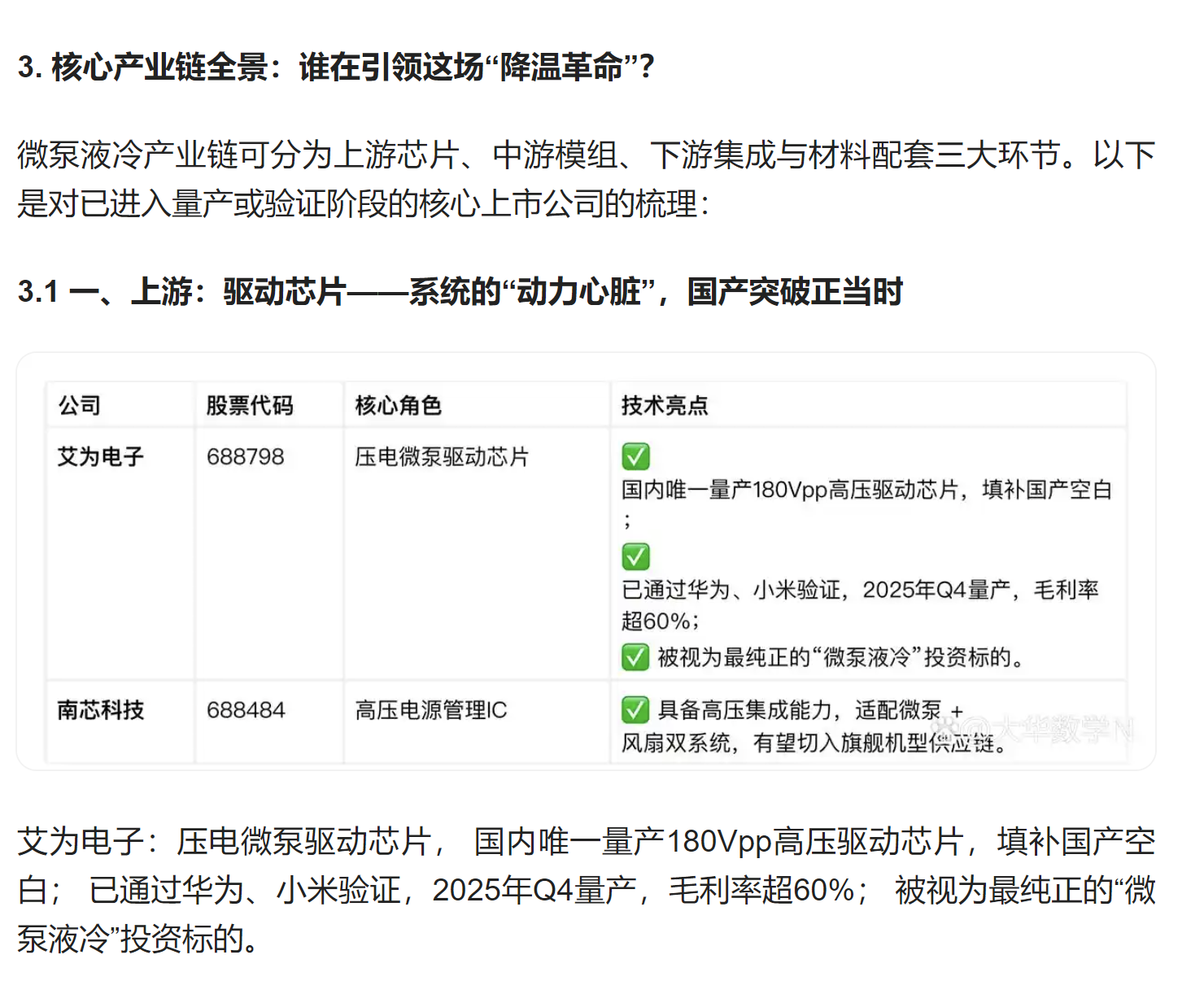 艾为电子:压电微泵驱动芯片,国内唯一量产180Vpp高压驱动芯片,填补国产空白; 已通过华为、小米验证,2025年Q4量产,毛利率超60%; 被视为最纯正的“微泵液冷”投资标的。华为M80手机也刚好是4季度发布上市。公司新一代压电微泵液冷主动散热驱动方案,作为解决高算力终端散热痛点的关键技术,相比被动散热,散热效率提升 300%,可快速带走 CPU、电池等核心部件的热量,高负载场景下温度可降低 10-15℃,避免设备因过热降频。终端产品算力和散热需求的提升,微泵液冷驱动有望成为公司的爆品料号,带动公司业绩成长。