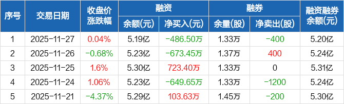 艾为电子:融资净偿还486.5万元,融资余额5.19亿元(11-27)