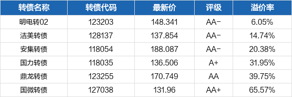 当前瑞可转债溢价率 = 100% *(债券面值 / 转股价值 - 1) = 100% *(100 / 103.11 - 1) = -3.02%。结合行业、评级等因素后筛选出如下相似转债: