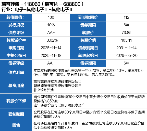 参考当前评级、规模等因子相似,正股行业相同的转债当前市场表现,瑞可转债上市首日转股溢价率区间预计为35% ~ 42%,对应首日收盘价预计区间在139.20 ~ 146.42元。